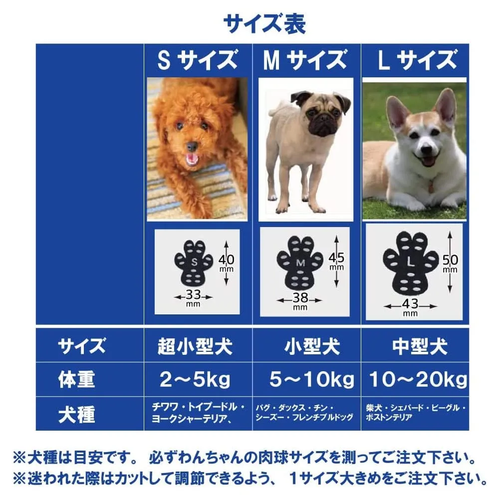 必ず愛犬の肉球のサイズを測ってご注文ください。ハサミでカットしてもご使用頂けますので、迷った場合は1サイズ大きめをご注文下さい。