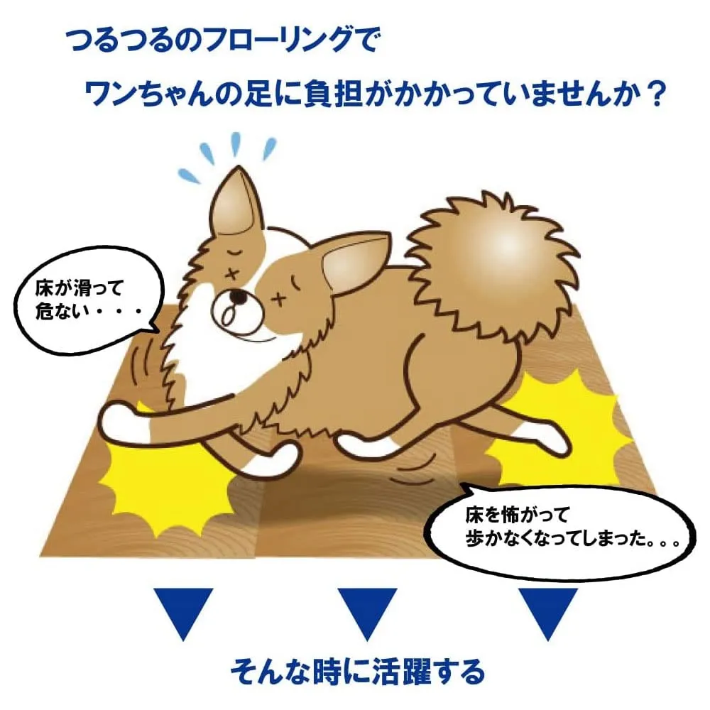 フローリングのような滑りやすい床では、犬は足が滑って上手く歩けない事があります。 滑ると足首、膝、股関節に余計な負担がかかり、最悪脱臼やヘルニアの原因にもなりかねません。 そんな時はワンちゃん用滑り止め肉球パッドをお試しください。