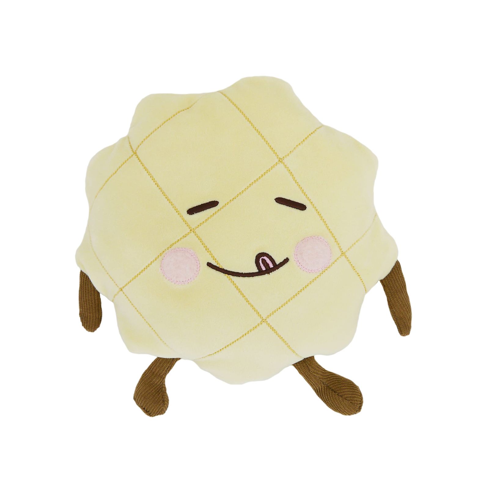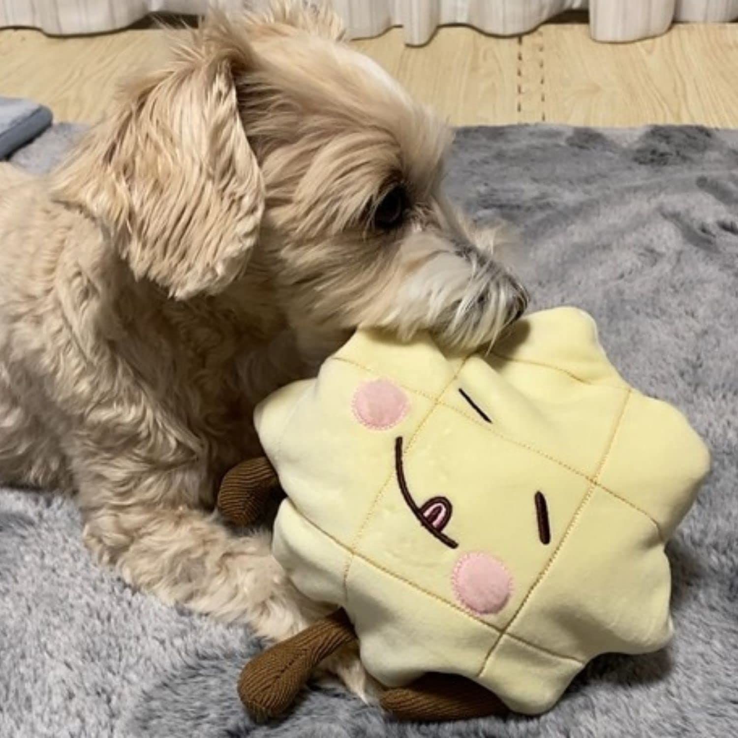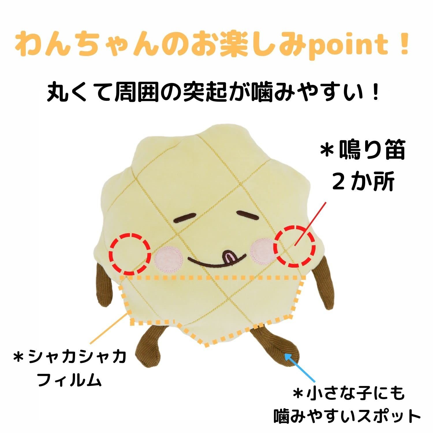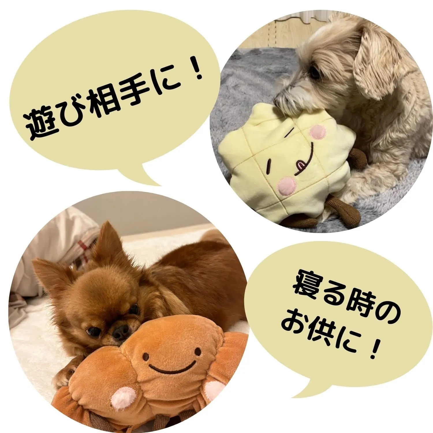 ふわもち触感のやわらかぬいぐるみ。お留守番や寝るときに安心させてくれるおおきなおもちゃ。よき遊び相手にもなります。かぶりつきやすい形状で、鳴り笛入りで音で興味津々!ぬいぐるみを咥えたり枕にして寝ている姿は可愛くインスタ映えかも?