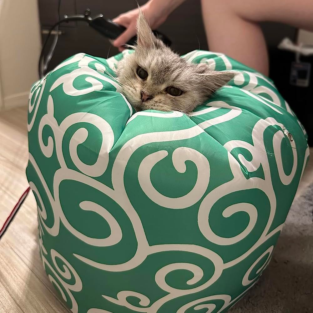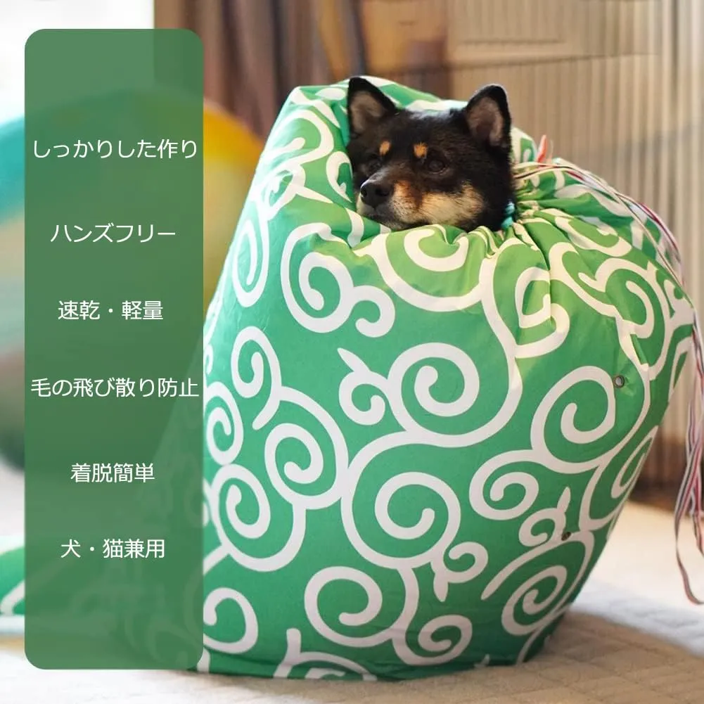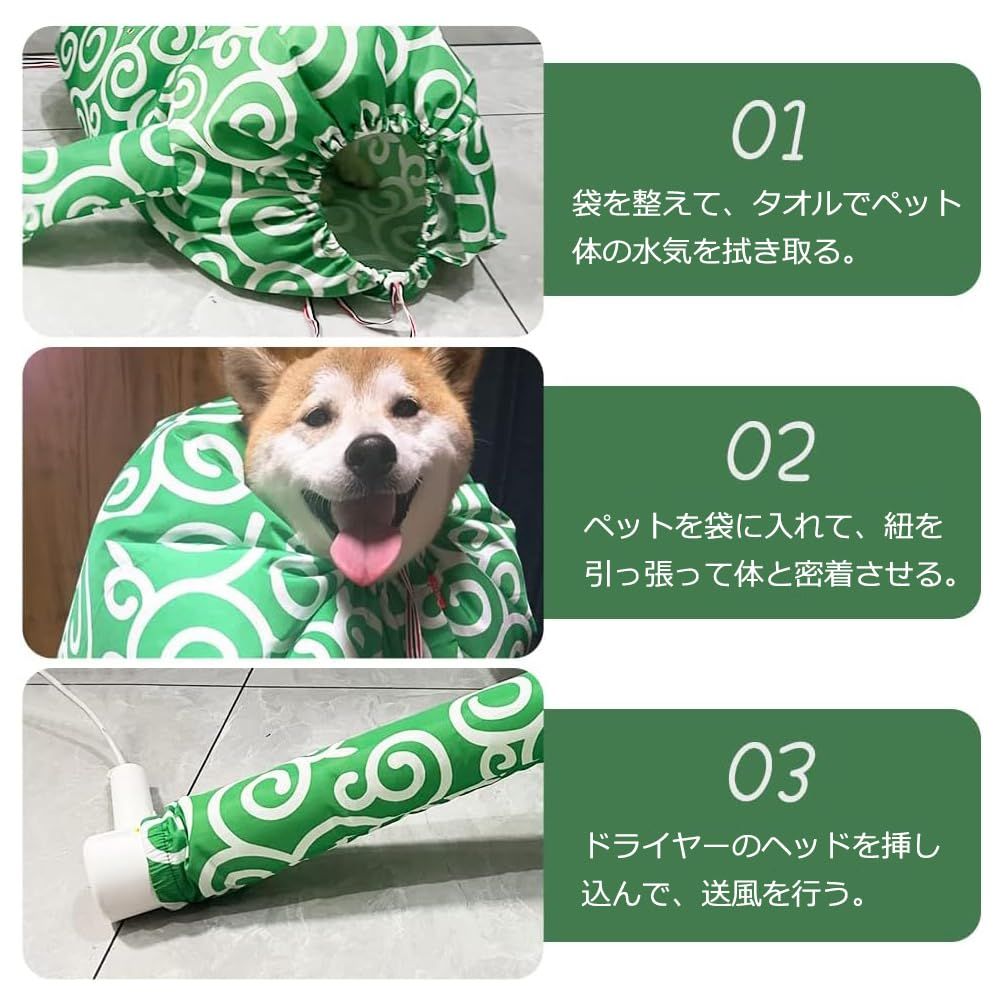 使用方法:①タオルでペット体の水気を拭き取る。②ペットを袋に入れて、紐を引っ張って体と密着させる。③ドライヤーのヘッドを挿し込む。④ドライヤーで送風を行う。ご注意:最初は熱風を送り、袋中の温度が暖かくなった後、冷風に調節してください。使用中はペットのそばに離れないでください。