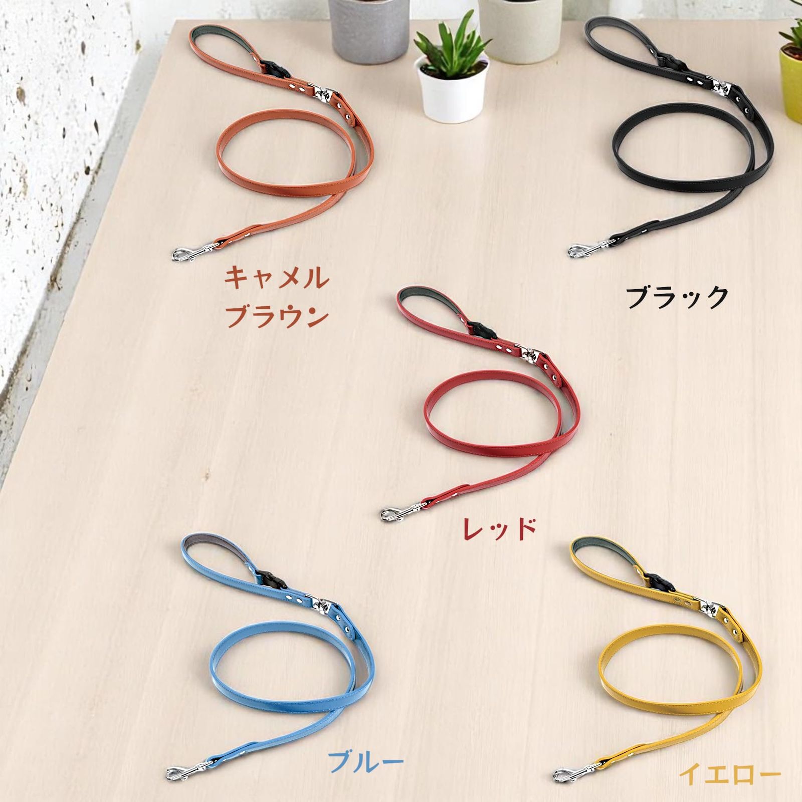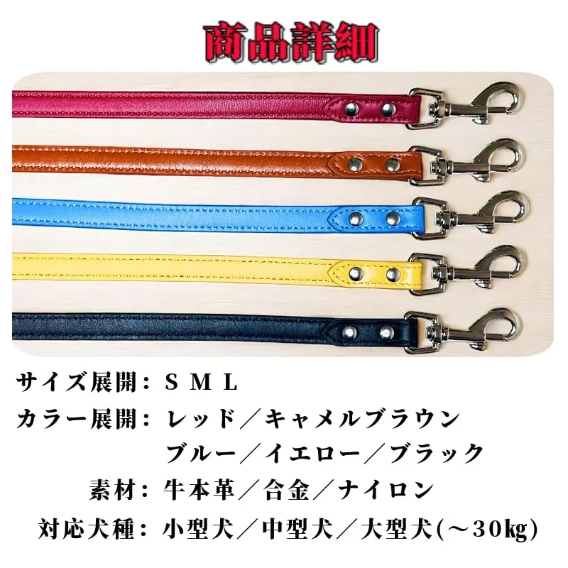 【5カラー展開で愛犬とのコーデも楽しめる】レッド/キャメルブラウン/ブルー/イエロー/ブラックの5色展開。毎日の散歩が楽しくなる、ファッション性も兼ね備えたデザインです。