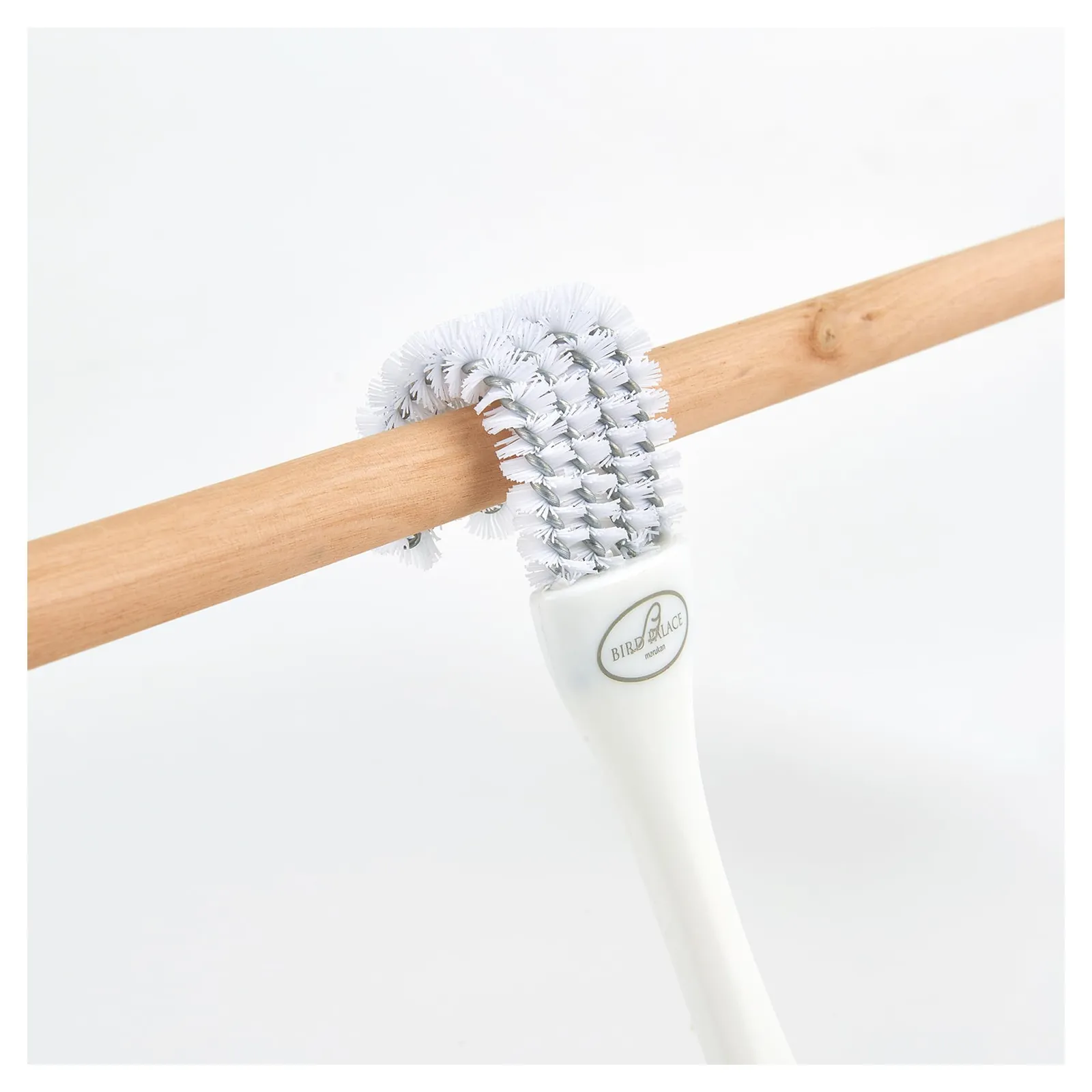 ●ブラシのカーブをとまり木に沿わせ、汚れをこすり落としてください。※直径10~20mmのとまり木に対応。※とまり木の太さに合わせて、ブラシのカーブ角度を手で微調整してください。ブラシ繊維でケガをしないようご注意ください。