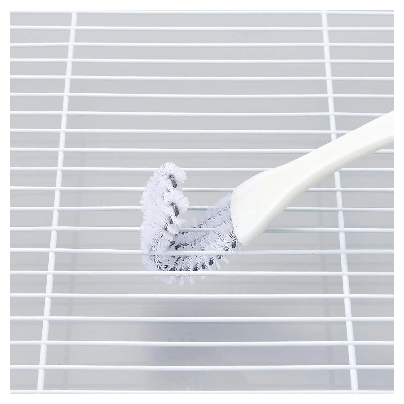 ●ブラシのスリットでフンキリ網のワイヤーを挟み込んで、汚れをこすり落としてください。※ワイヤー間隔8~10mmに対応。※ワイヤー間隔に合わせて、ブラシのスリット幅を手で微調整してください。ブラシ繊維でケガをしないようご注意ください。