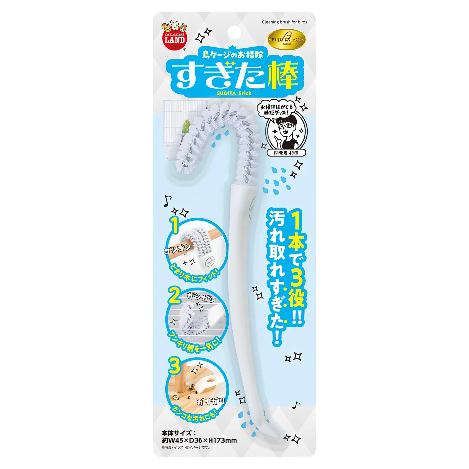 小鳥ケージでのお掃除の手間が省ける1本で3役のブラシです。