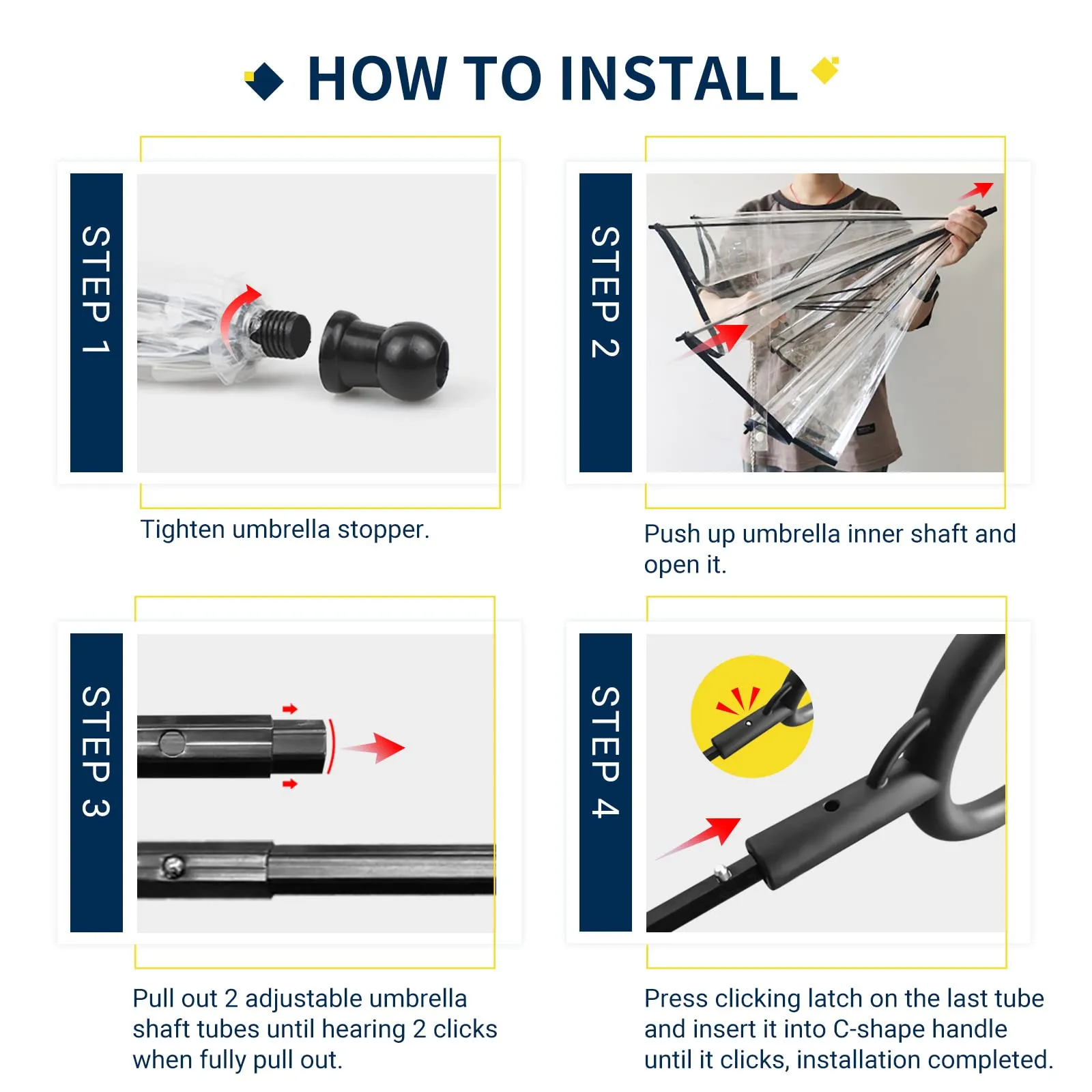 取付簡単:ステップ1.傘キャップを取付る。ステップ2.手あるいはペンチで中棒を引き出す。ステップ3.ステップ 3 - 最後のチューブのクリック ラッチを押し、カチッと音がするまで C 字型ハンドルに挿入します。取り付けが完了します。