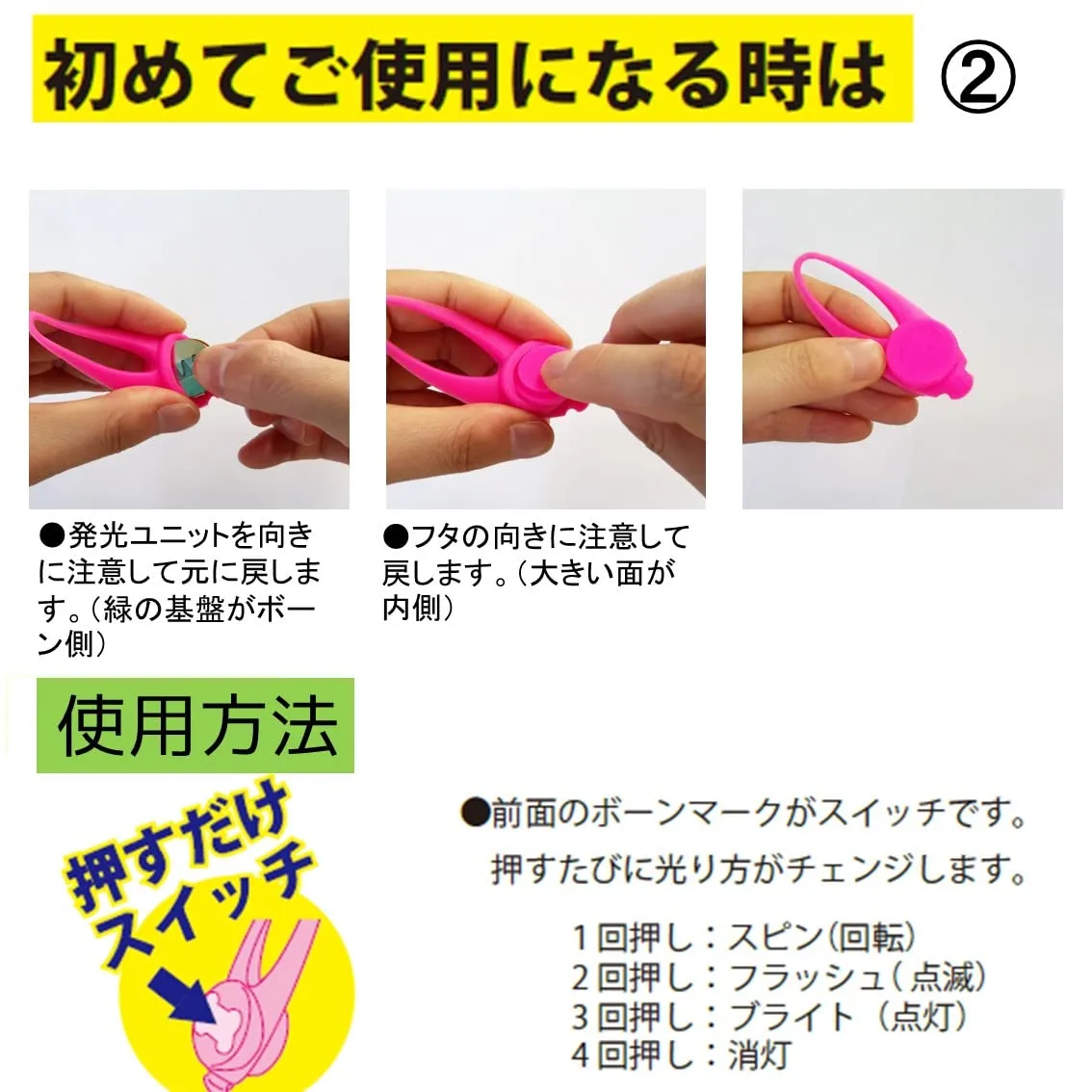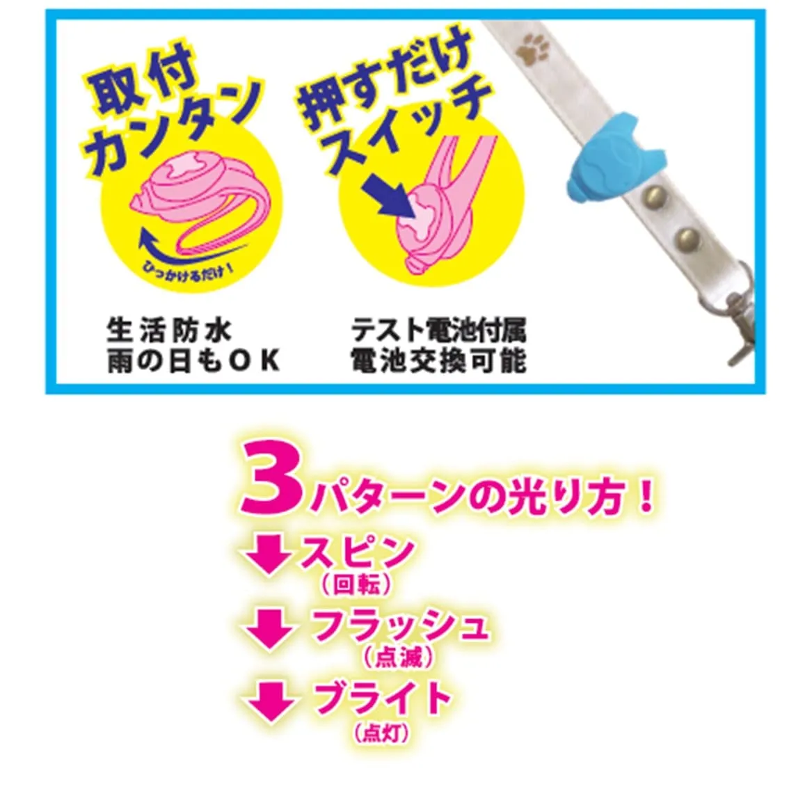 ●取付簡単なお散歩用安全ライト。回転フラッシュ・フラッシュ・点灯の3モード選択可能。