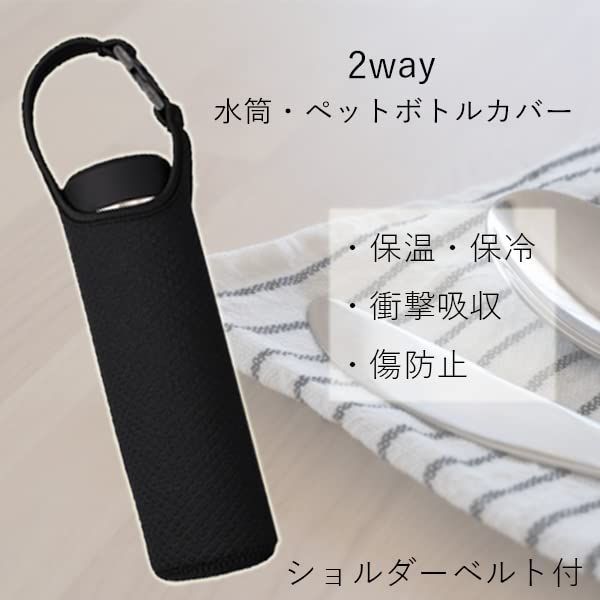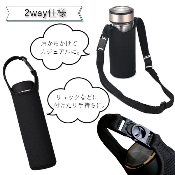 衝撃吸収に優れたネオプレン素材でボトルを守ります。 伸縮性が高い素材なので600mlまでのペットボトルや水筒にフィットします。 専用ストラップ付きで斜めがけのショルダーとしても使えます。