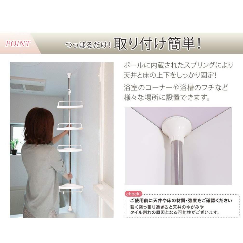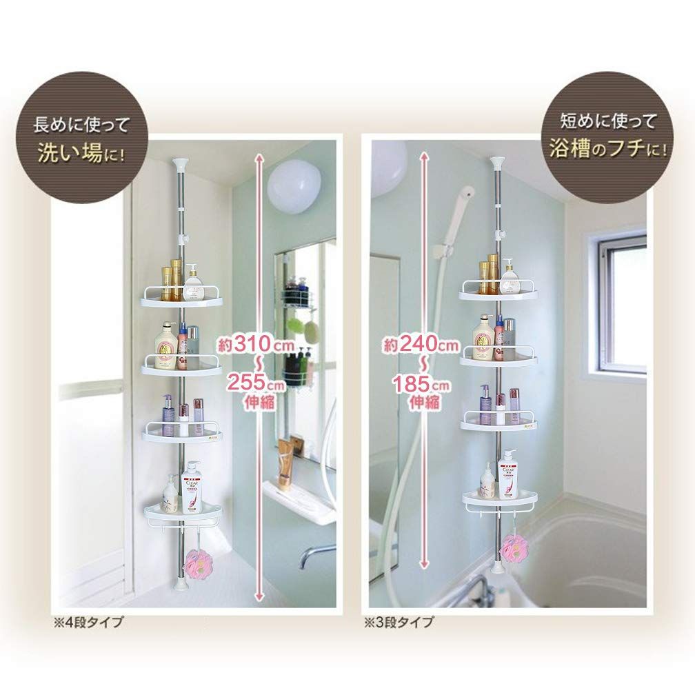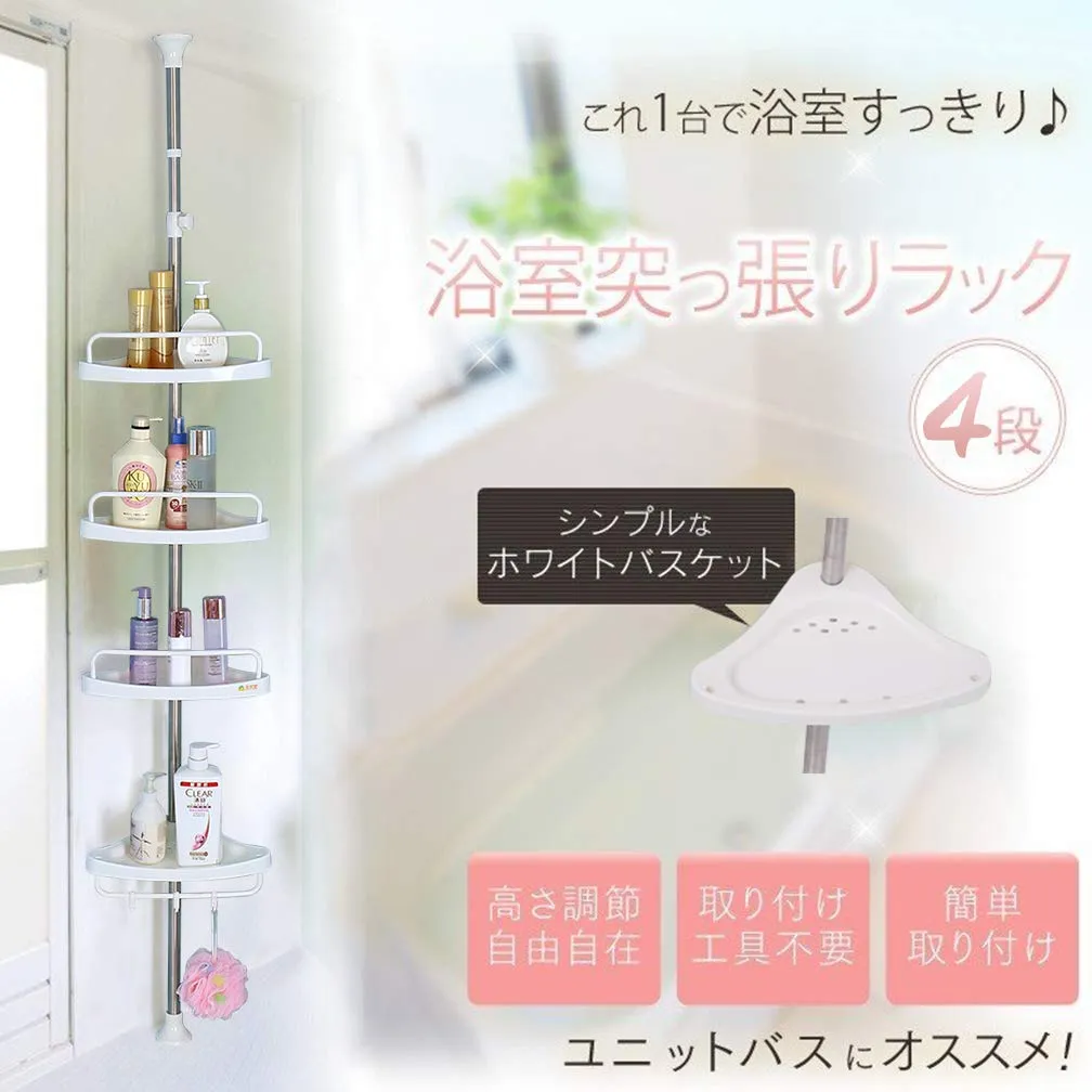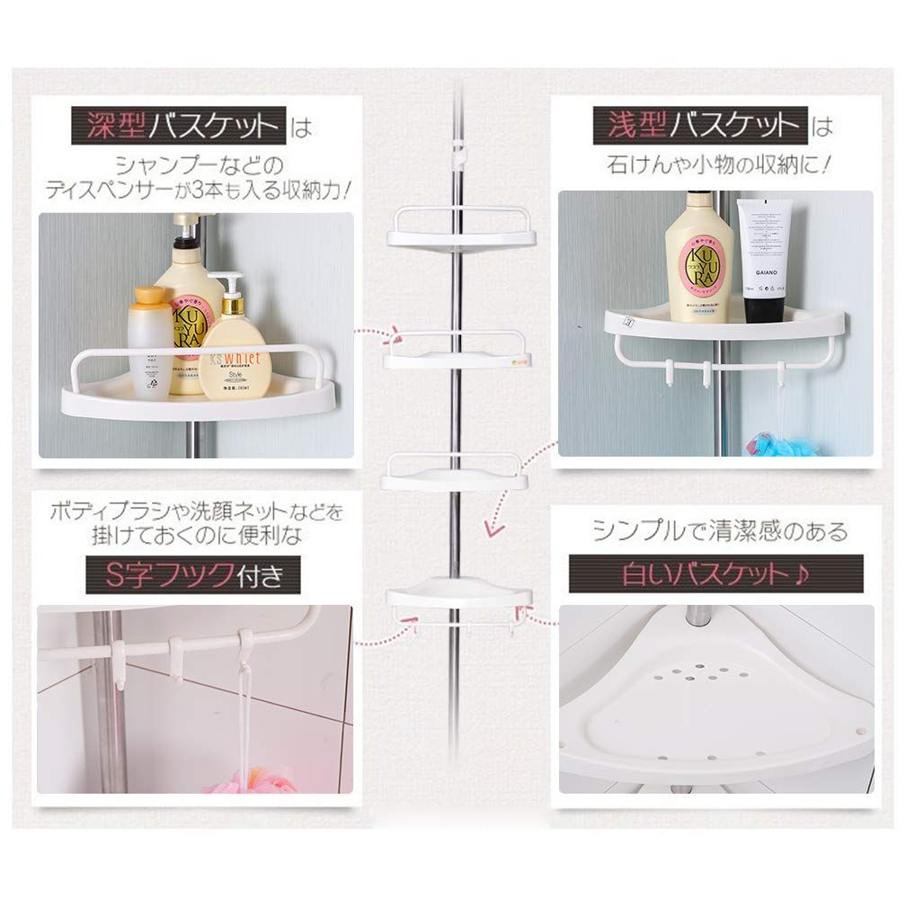 ●収納力アップ:お風呂場や、バスルームの小物を綺麗にスッキリ収納。つっぱり式コーナーバスラックは4段式でシャンプー類やボディーソープ、スポンジにお子様のおもちゃなどこれ一つあれば省スペースでたっぷり収納出来ます。