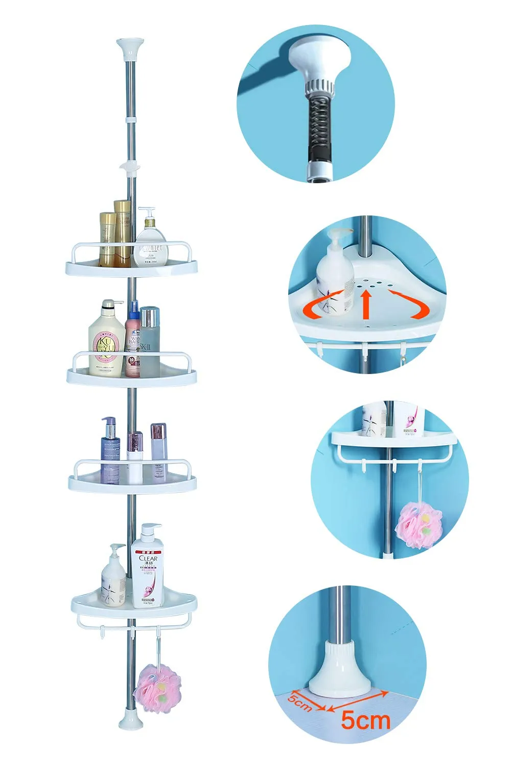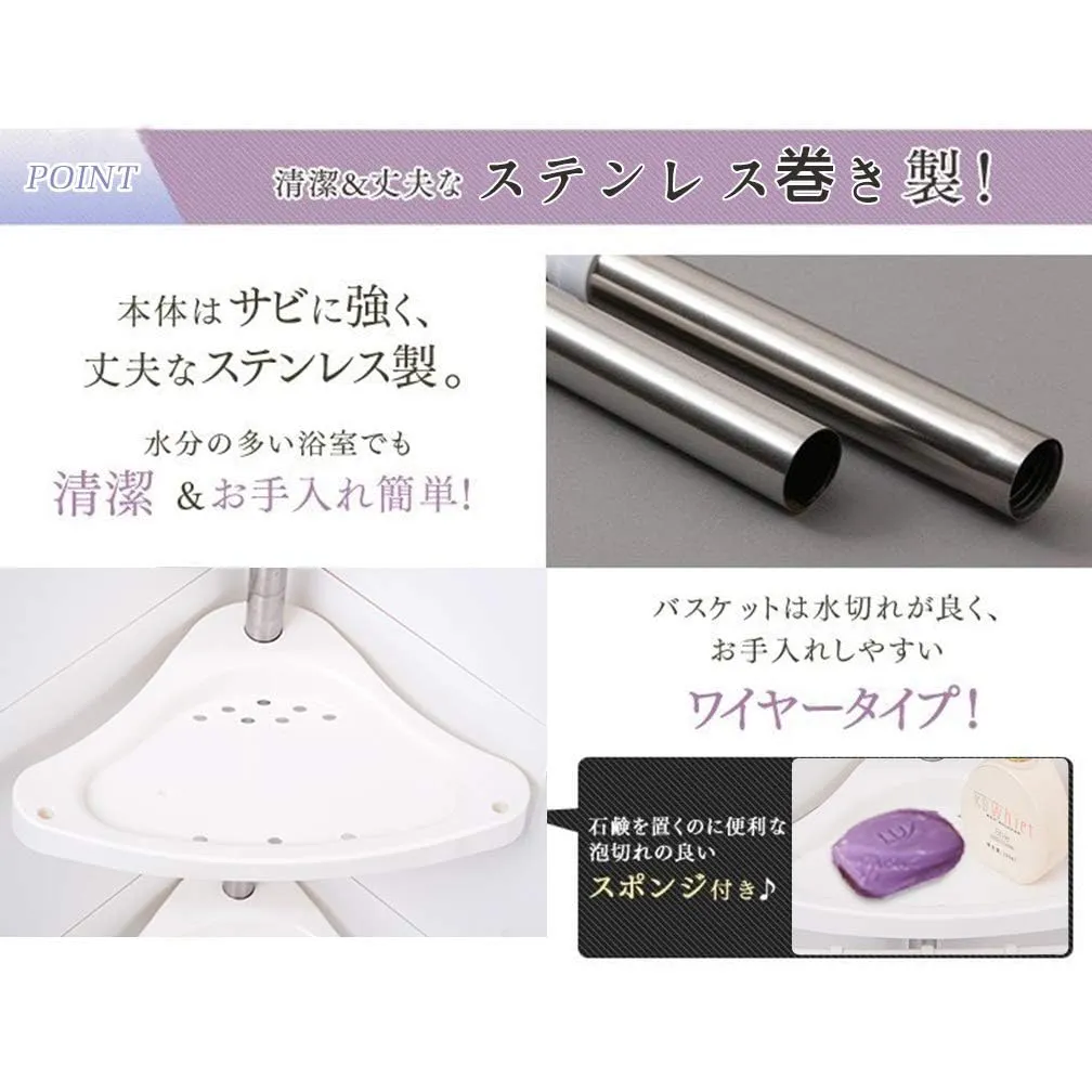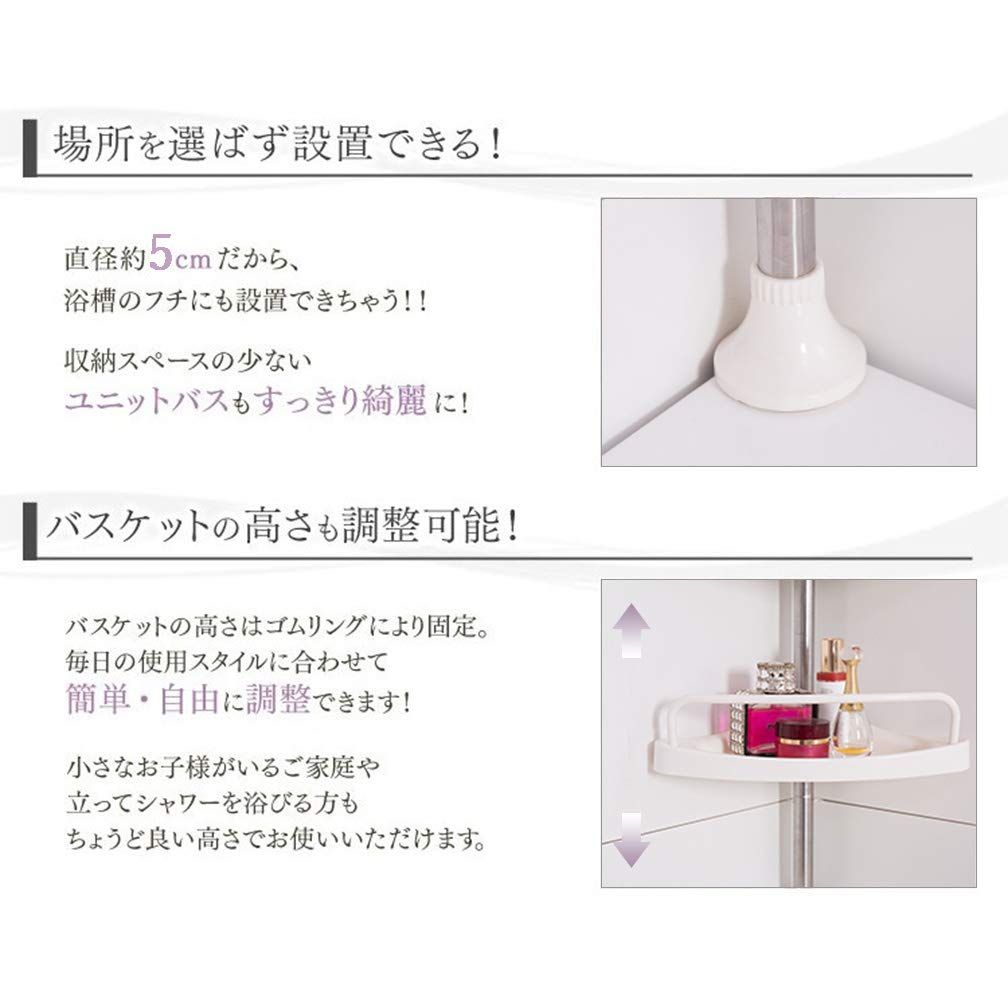 ●収納力アップ:お風呂場や、バスルームの小物を綺麗にスッキリ収納。つっぱり式コーナーバスラックは4段式でシャンプー類やボディーソープ、スポンジにお子様のおもちゃなどこれ一つあれば省スペースでたっぷり収納出来ます。