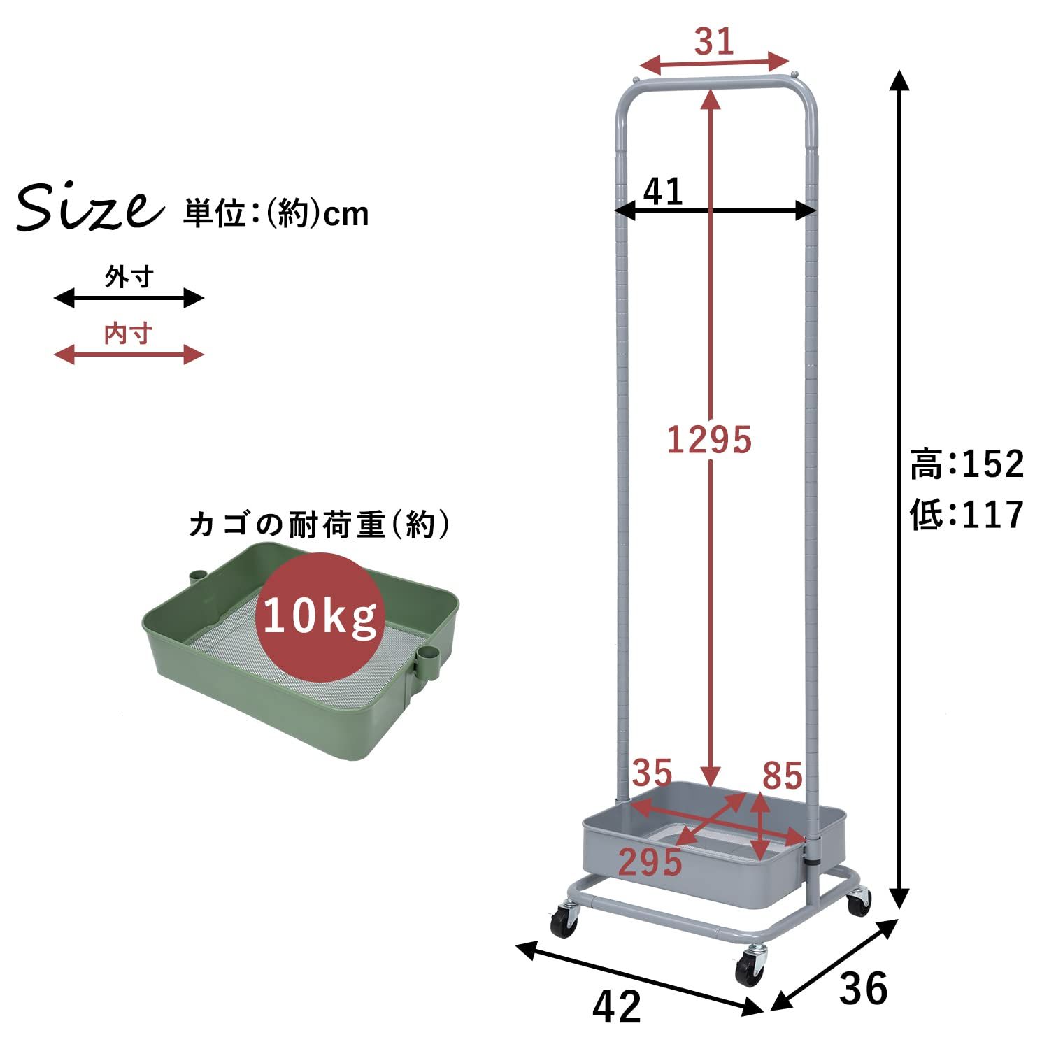 (約)幅42×奥行36×高さ152(117)cm(約)幅42×奥行36×高さ152(117)cm カゴ耐荷重:約10kg ハンガーポール耐荷重:約45kg