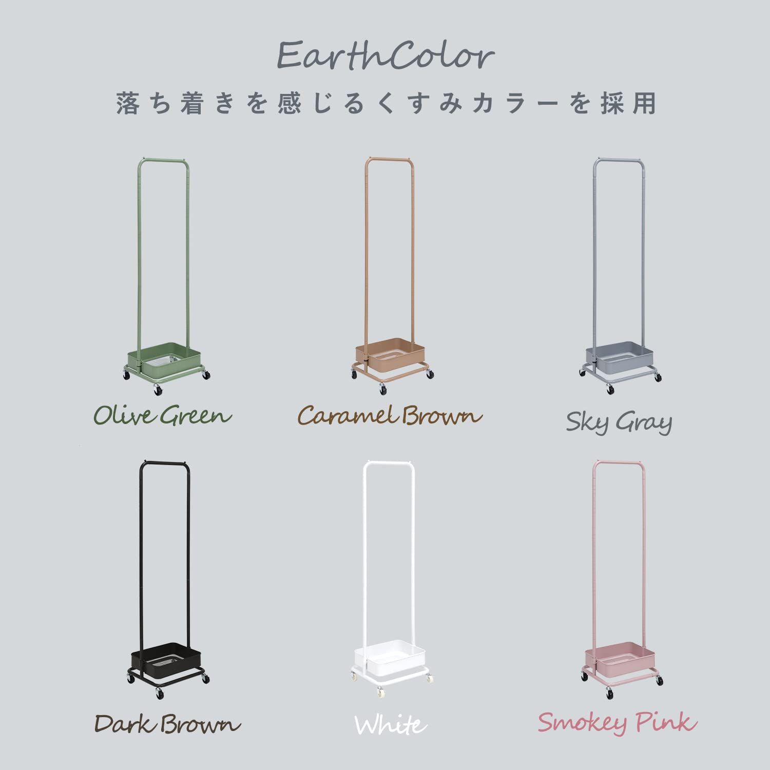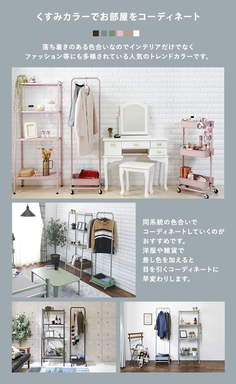 高さが変えられるバスケット付きハンガーラック。落ち着きのあるくすみカラーを採用。