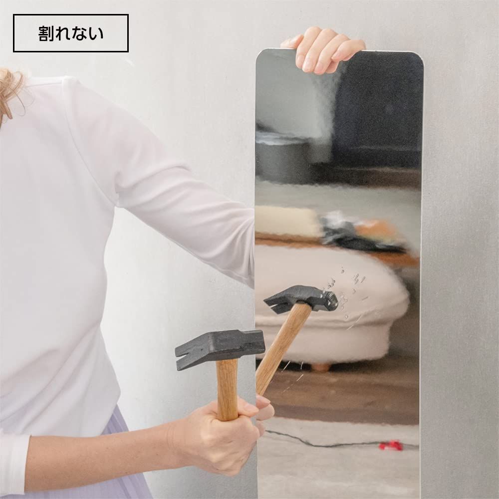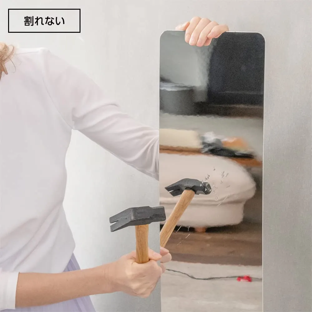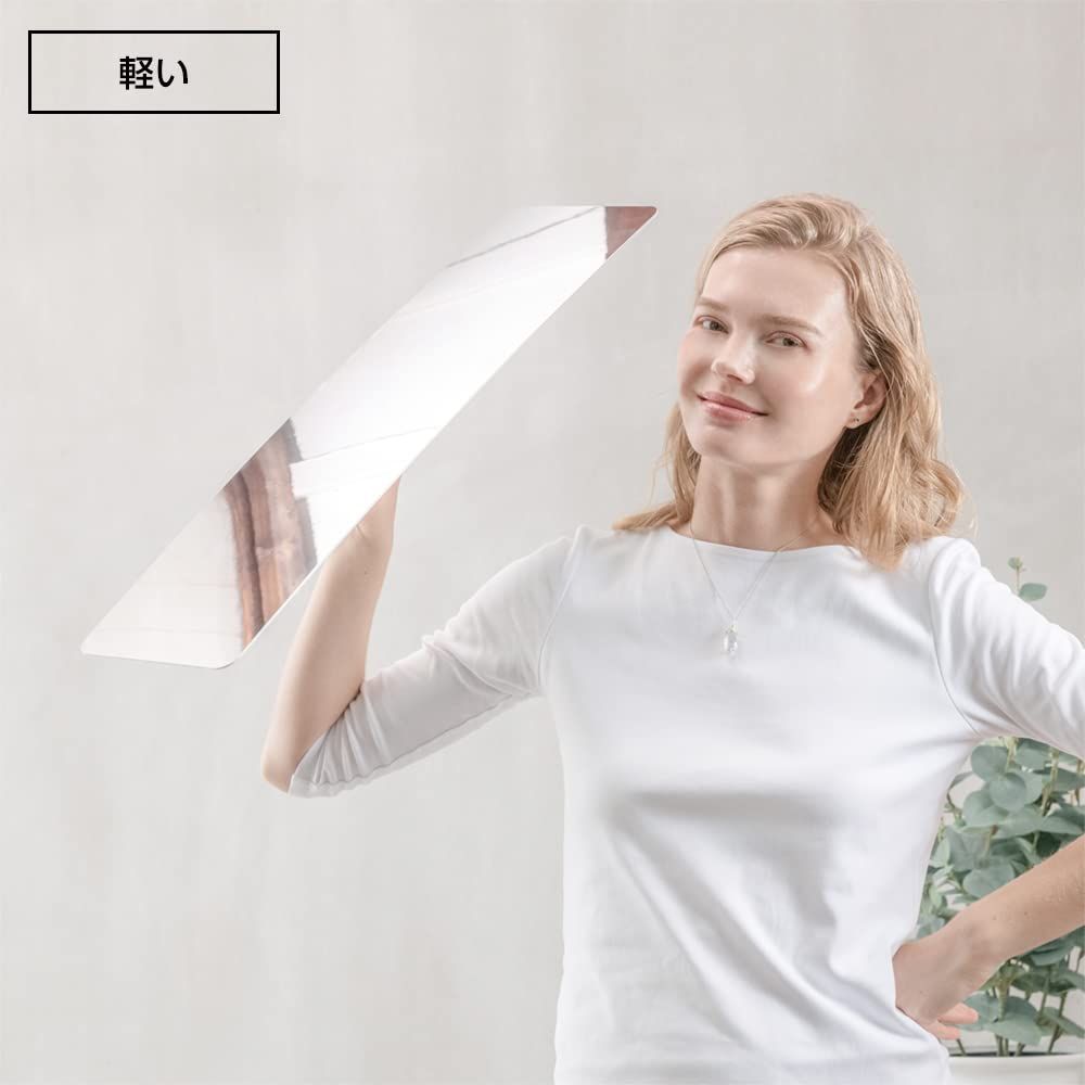 【軽い】厚みはわずか2ミリの貼ってはがせるシールタイプ、重さは一般的なガラスミラーの半分以下の軽さ。ミラー表面はハードコート仕様で、キズがつきにくいです。*樹脂ミラーの特性上ガラスミラーに比べて若干のひずみが出ます。