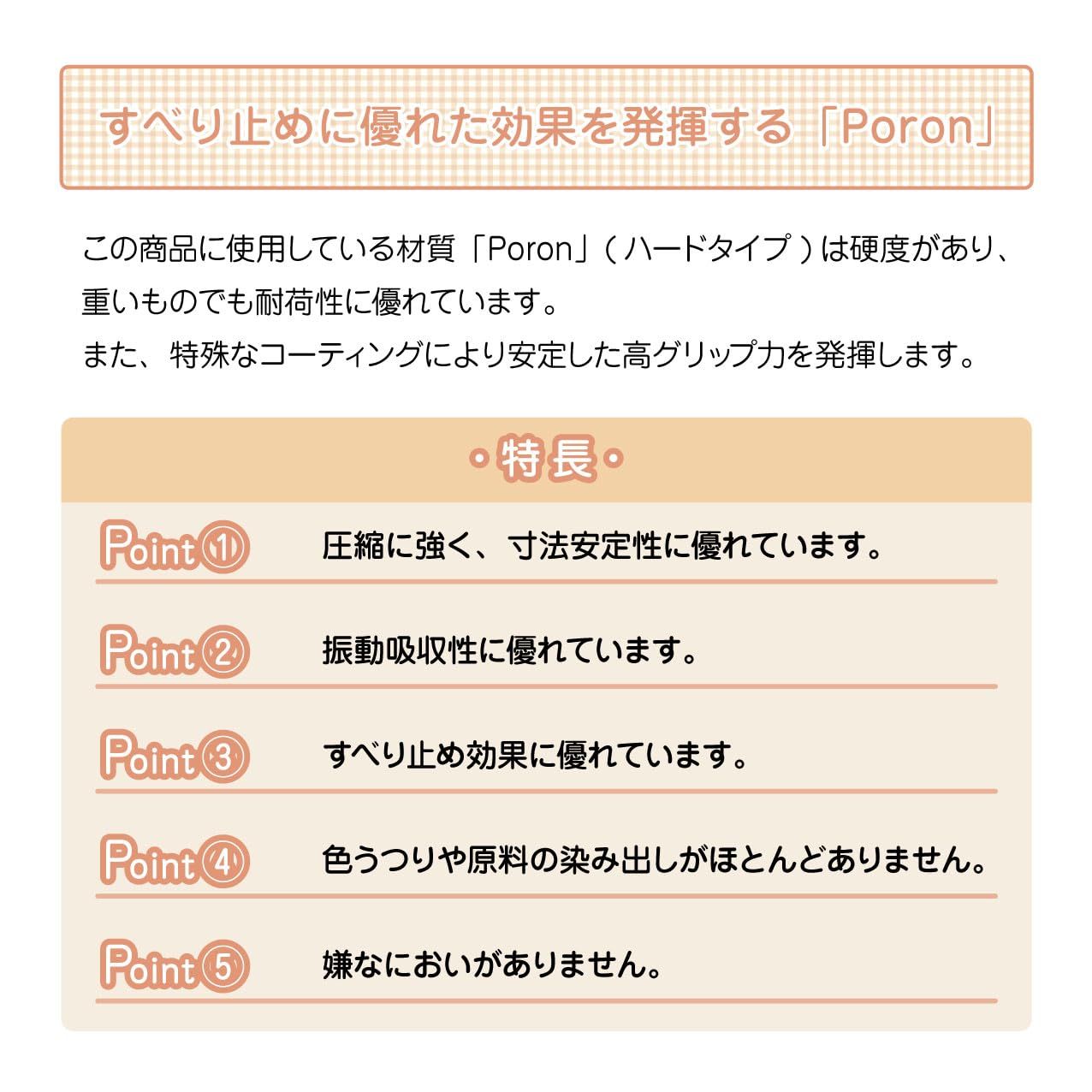 この製品に使用している材質「PORON」(ハードタイプ)は硬度があり、重いものでも耐荷性に優れています。また、特殊なコーティングにより安定した高グリップ力を発揮します。