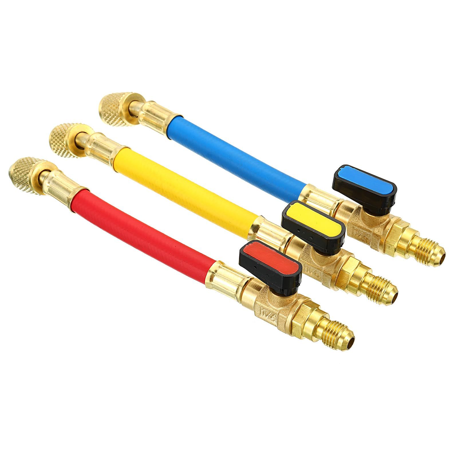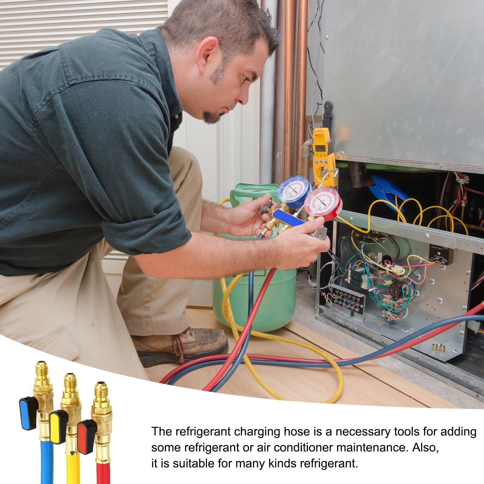 指示:一方の端はエアコンシステムに接続し、もう一方の端は冷媒の充電缶に接続します。ホースのボールバルブは、冷媒の流れをよりよく制御するのに役立ちます。
