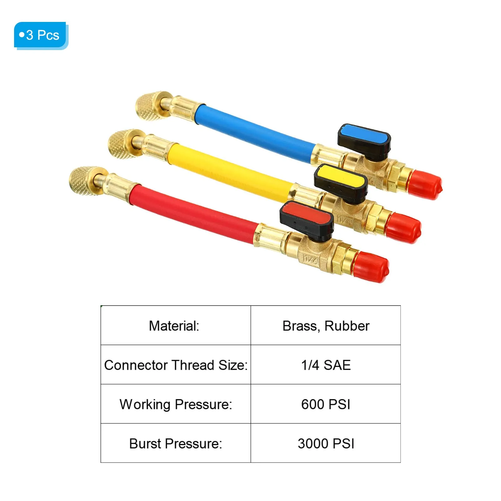 カラー:レッド、イェロー、ブルー; 材質:真鍮、ゴム; 長さ:1.5 m; コネクタのネジサイズ (オスとメス):1/4 SAE; 使用圧力:800 PSI; バースト圧力:4000 PSI; パッキングリスト:3個 x 充電ホースチューブ