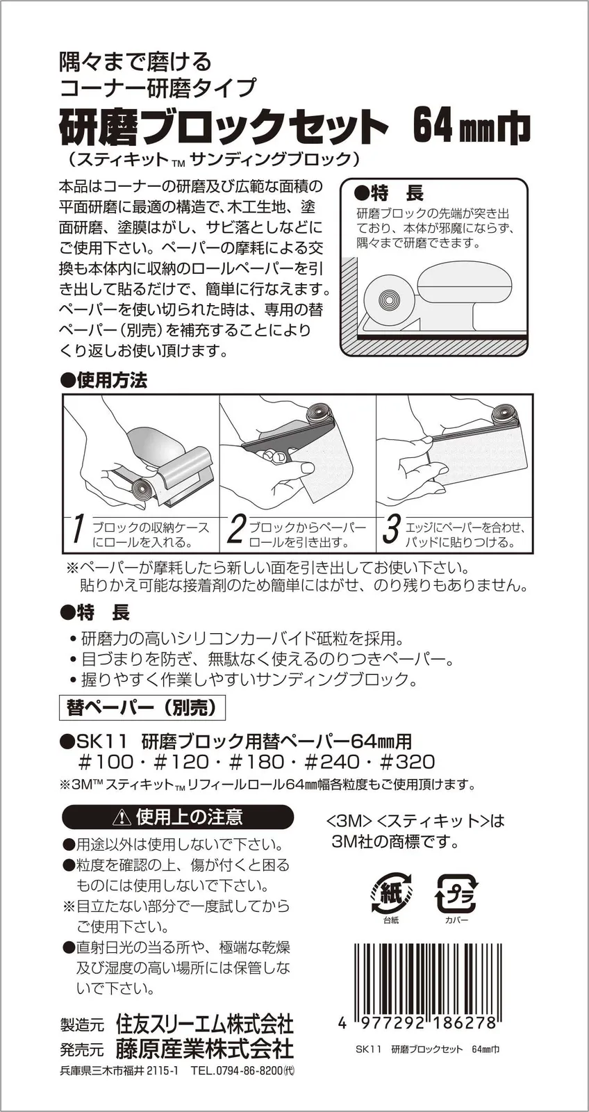 ・本品はコーナーの研磨及び広範な面積の平面研磨に最適の構造で、木工生地、塗面研磨、塗膜はがし、サビ落としなどに便利