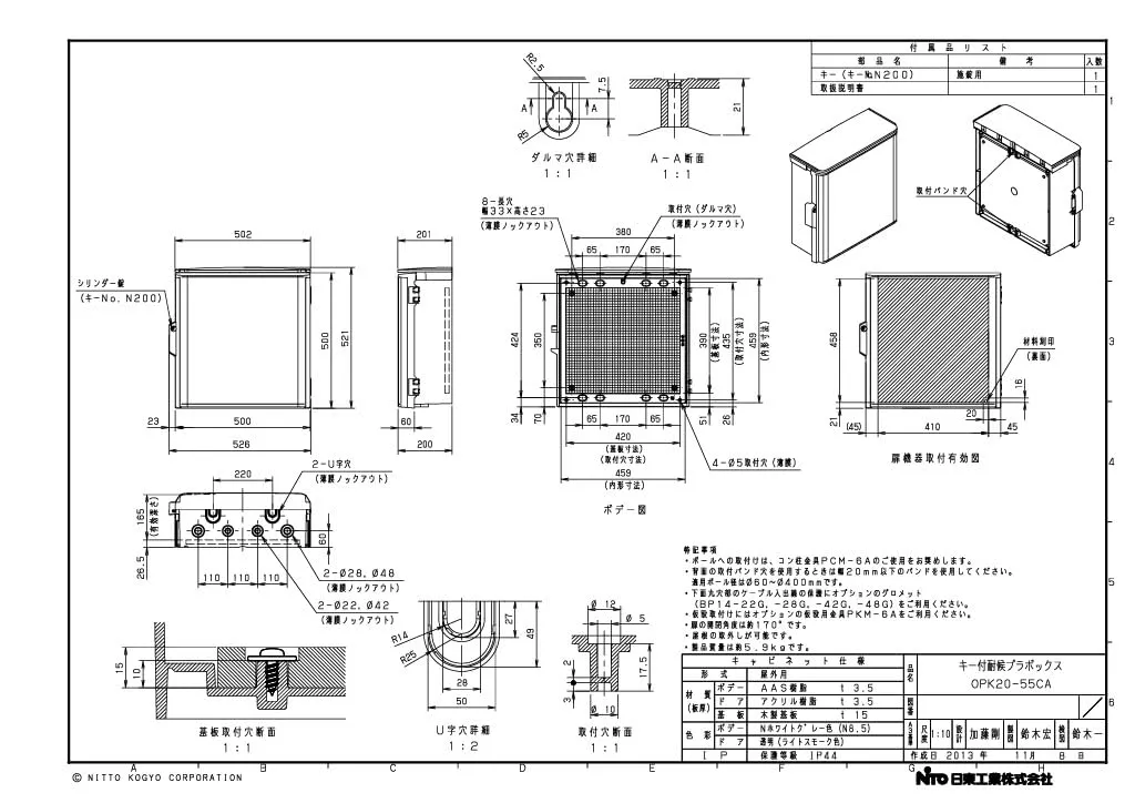 ●耐候性の良いAAS樹脂の採用により、日差しによる変色や機械強度の低下が少なく、CATV関連機器、通信用無線機器の収納用など、キャビネットの耐候性を考慮する場合に適しています。