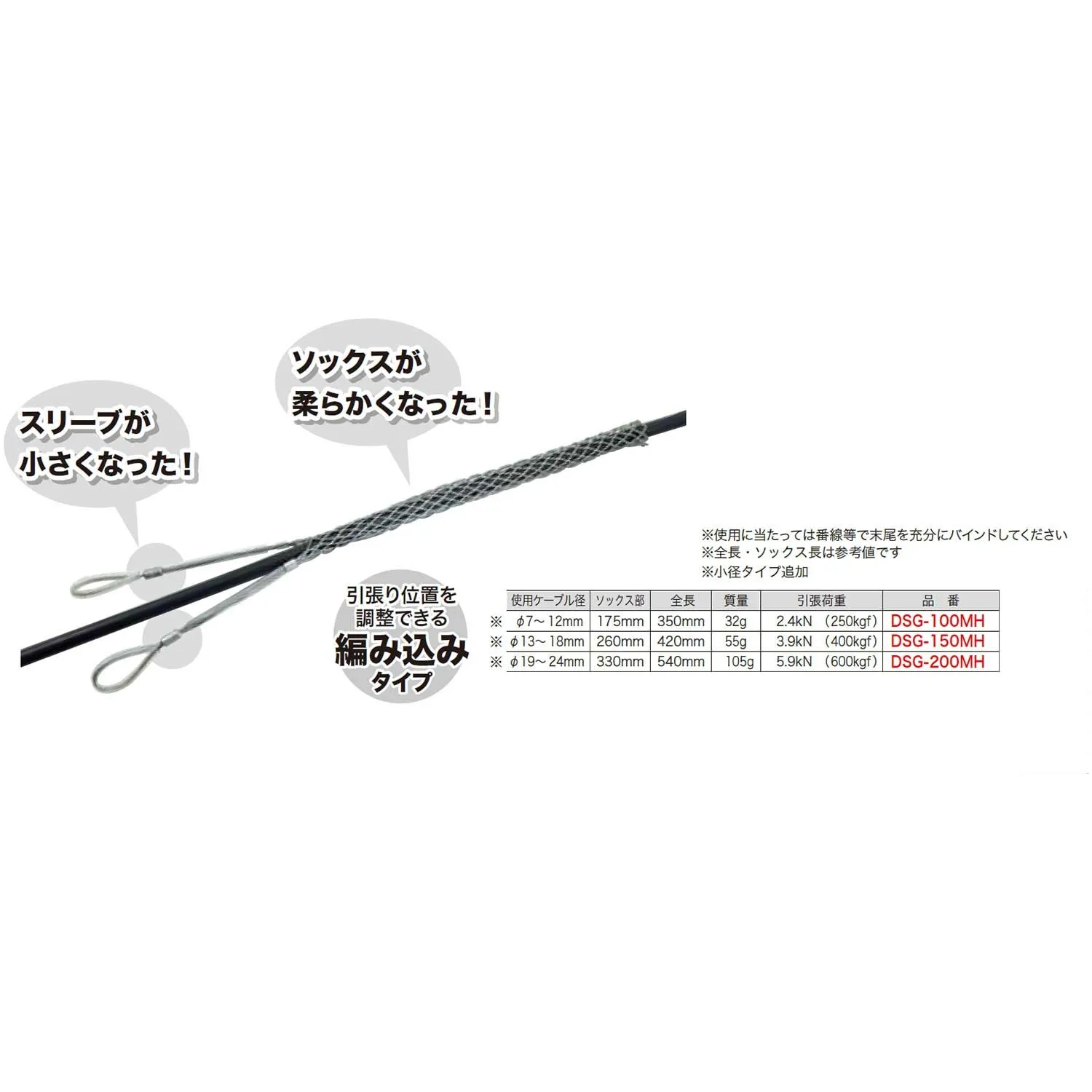 仕様:使用ケーブル径φ7~12mm/ソックス部175mm/全長350mm/質量32g/引張荷重2.4kN(250kgf)
