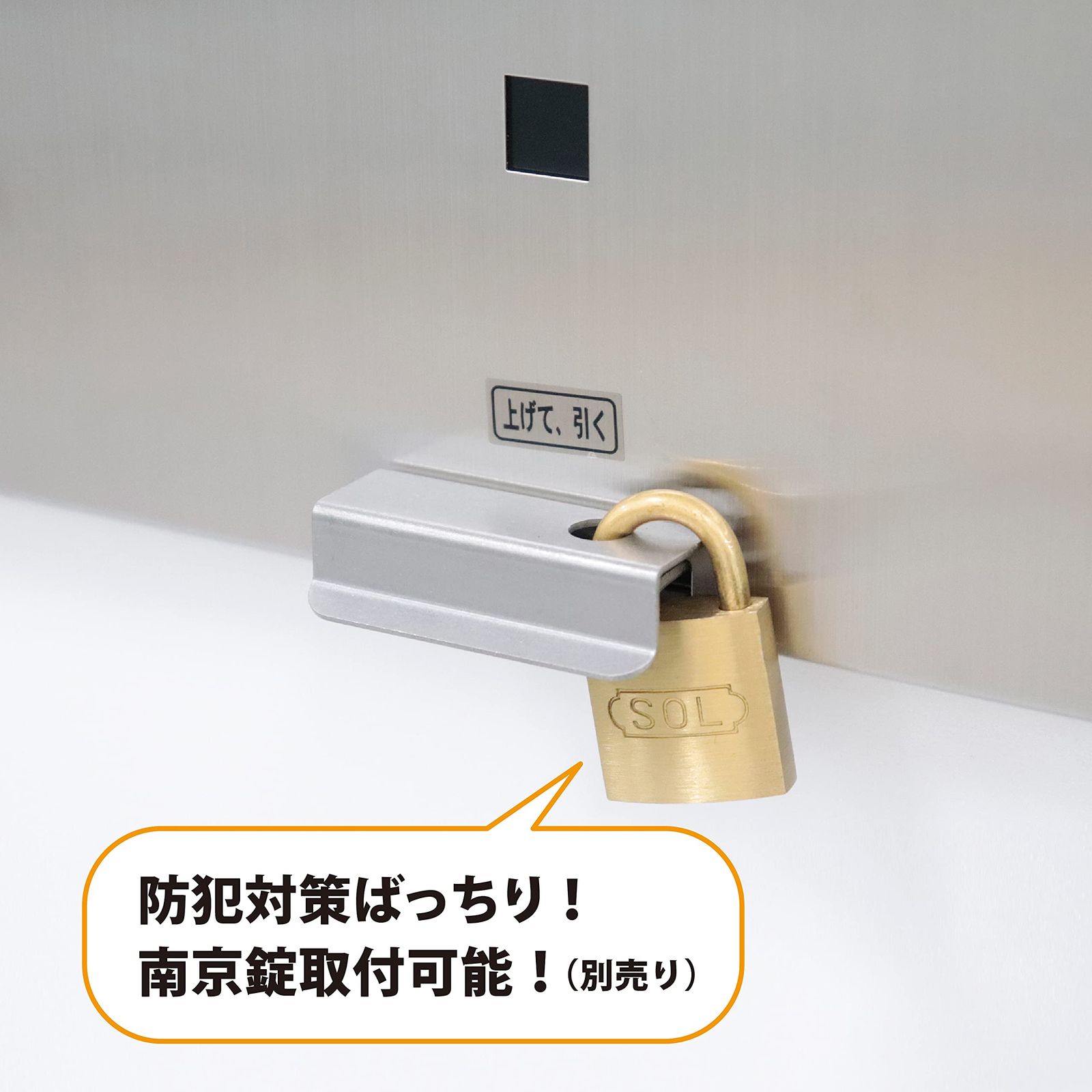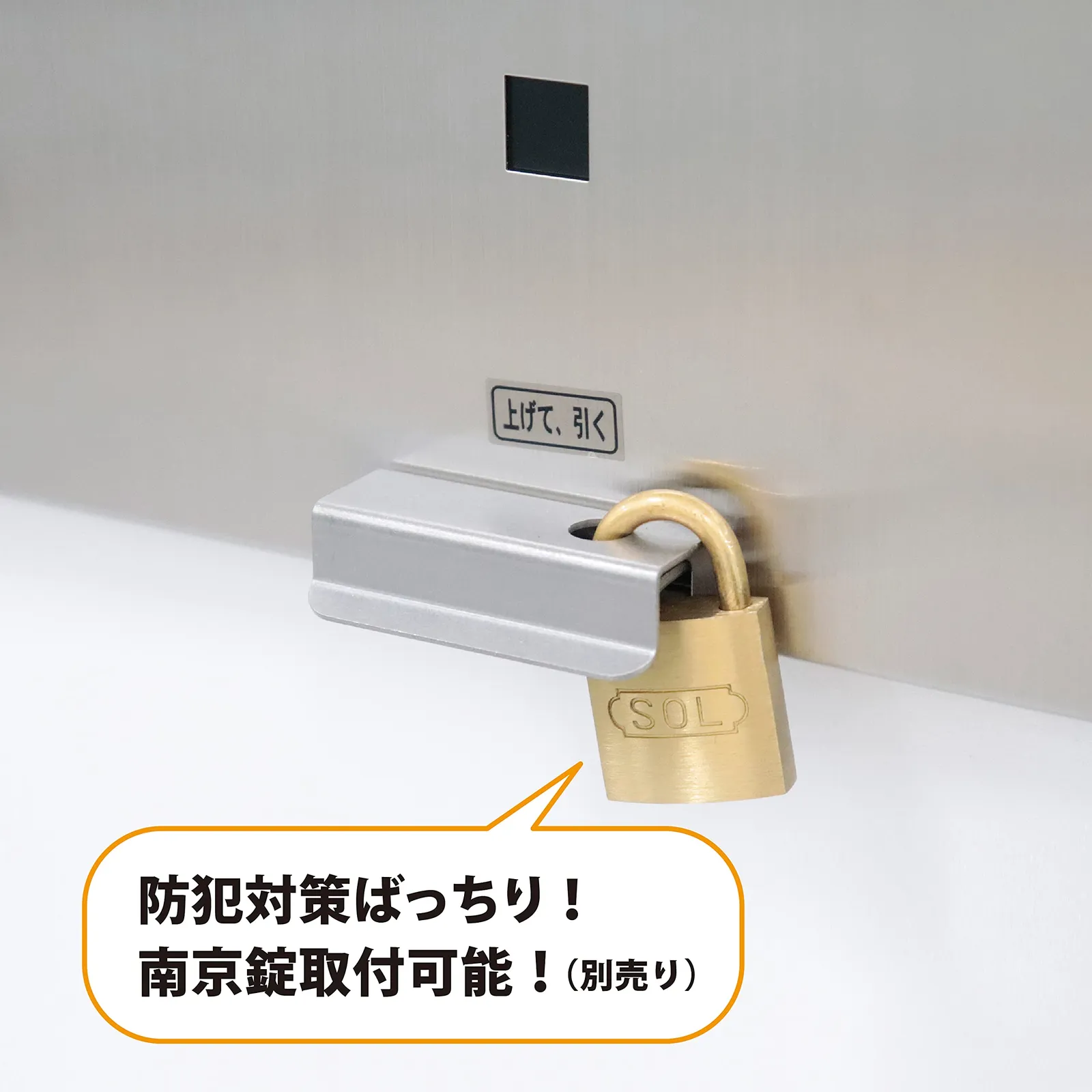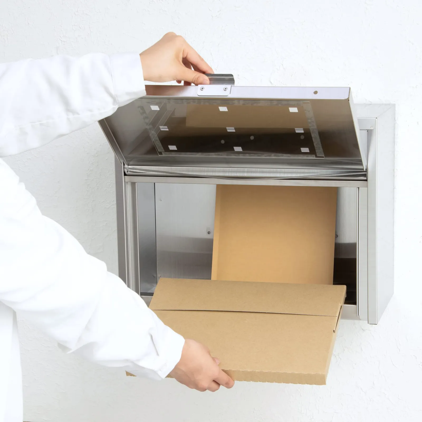 さびにくく耐久性のあるステンレス製の大型ポストです。住宅と調和するモダンなデザインです。幅が広く、B4サイズ封筒や回覧板、雑誌がラクラク入ります。投函可能サイズはW340×D260×H35㎜です。市販の内径φ7㎜南京錠(別売)を取り付けてることで大切な郵便物を守ります。