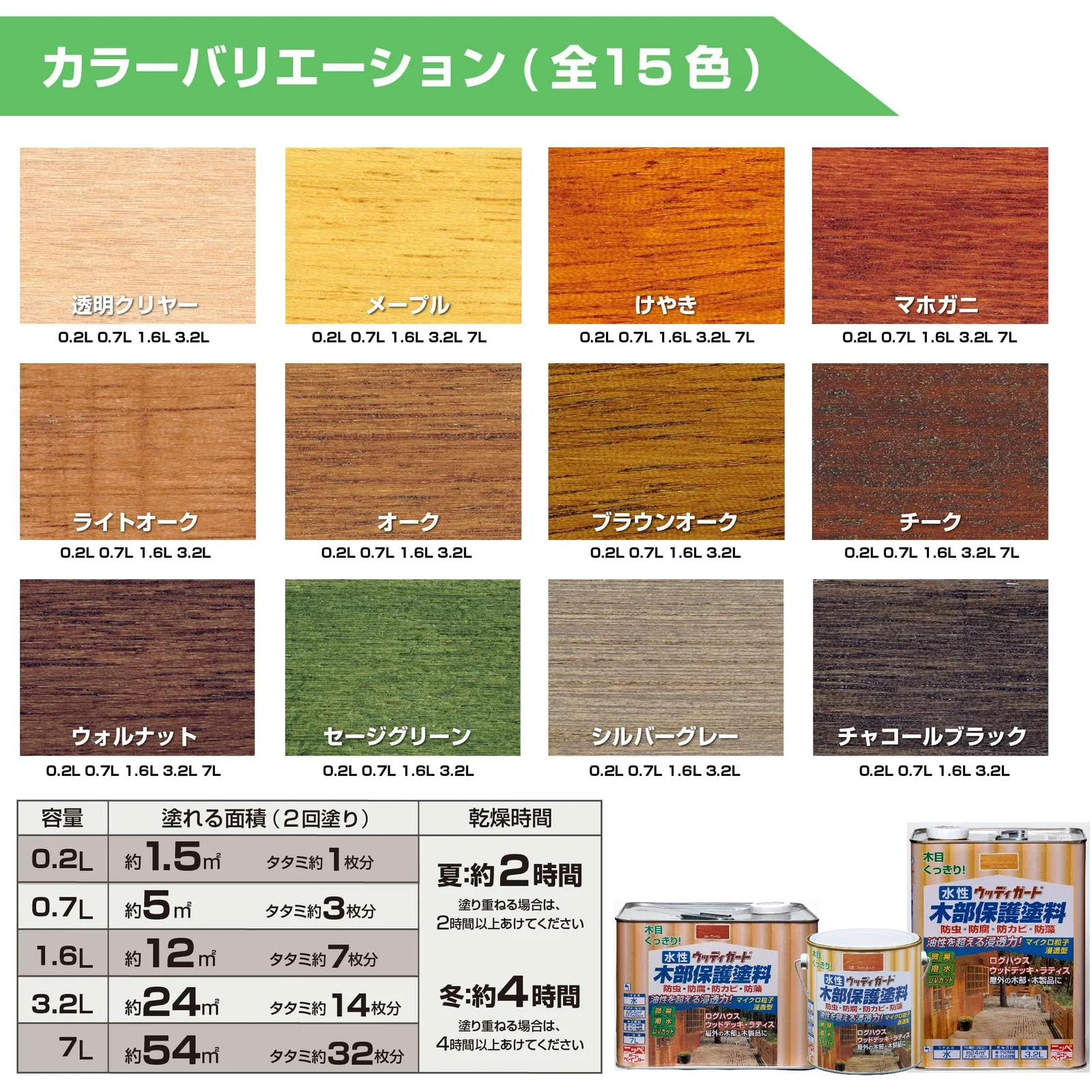 乾燥時間:夏約2時間、冬約4時間、※塗り重ねるときは1回目がよく乾いてから2回目を塗ること