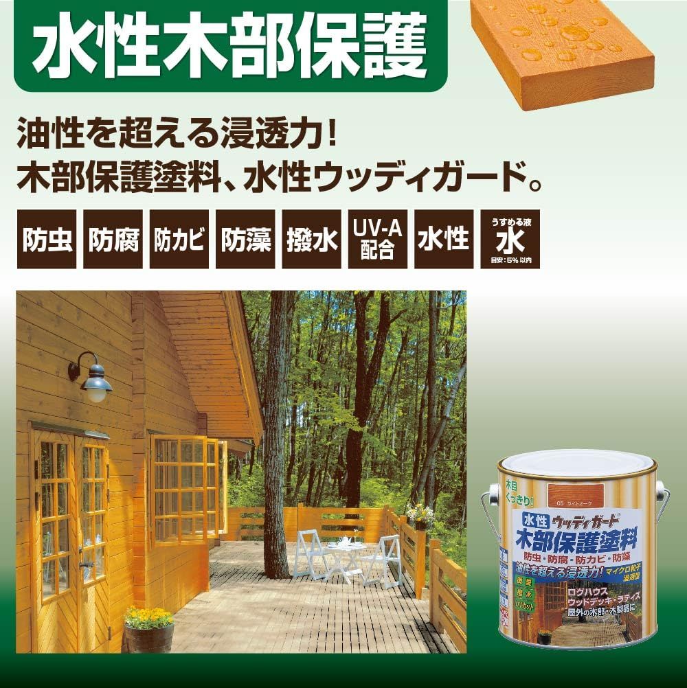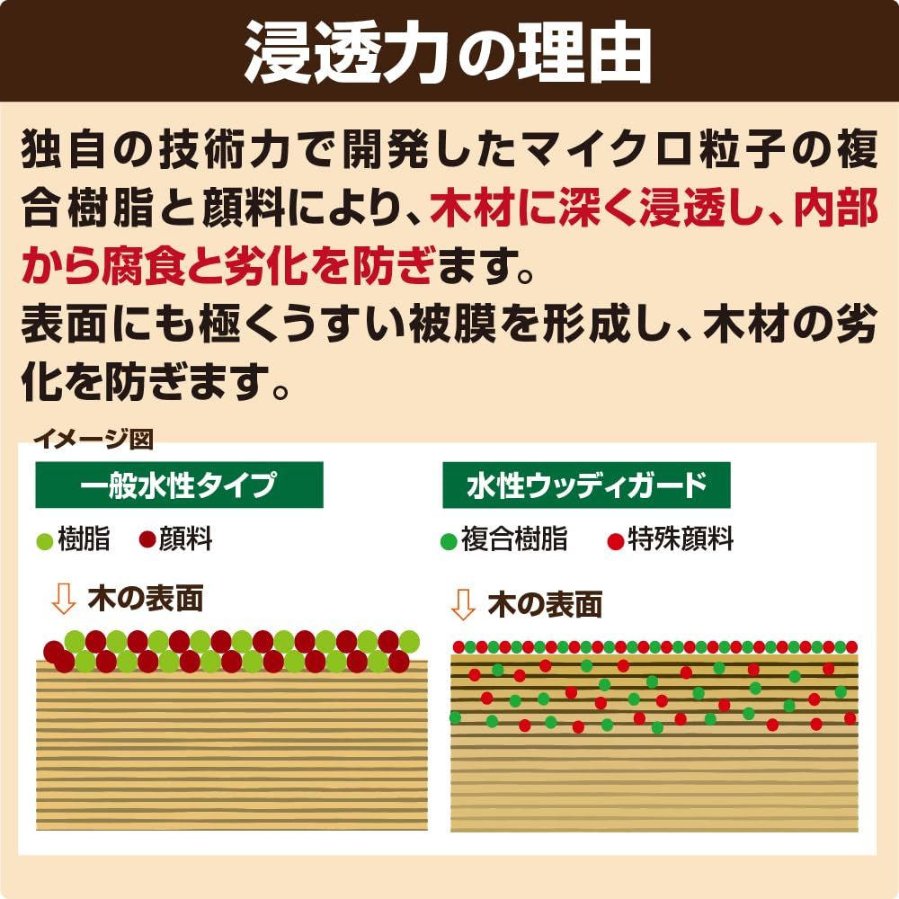 マイクロ粒子浸透型の新しい微臭の水性木部保護塗料です。 木材の防虫・防腐・防かび・防藻効果に優れ、木材に浸透して内部から木の腐食を防ぎます。 耐候性に優れたマイクロ粒子浸透型顔料の採用で、木目がよりくっきりキレイな仕上がりになります。 日光による木の焼けを防ぐために、紫外線吸収剤を配合し色アセ・劣化を防止します。(UVカット) 自然にやさしい蜜蝋成分を配合し、はっ水効果があります。