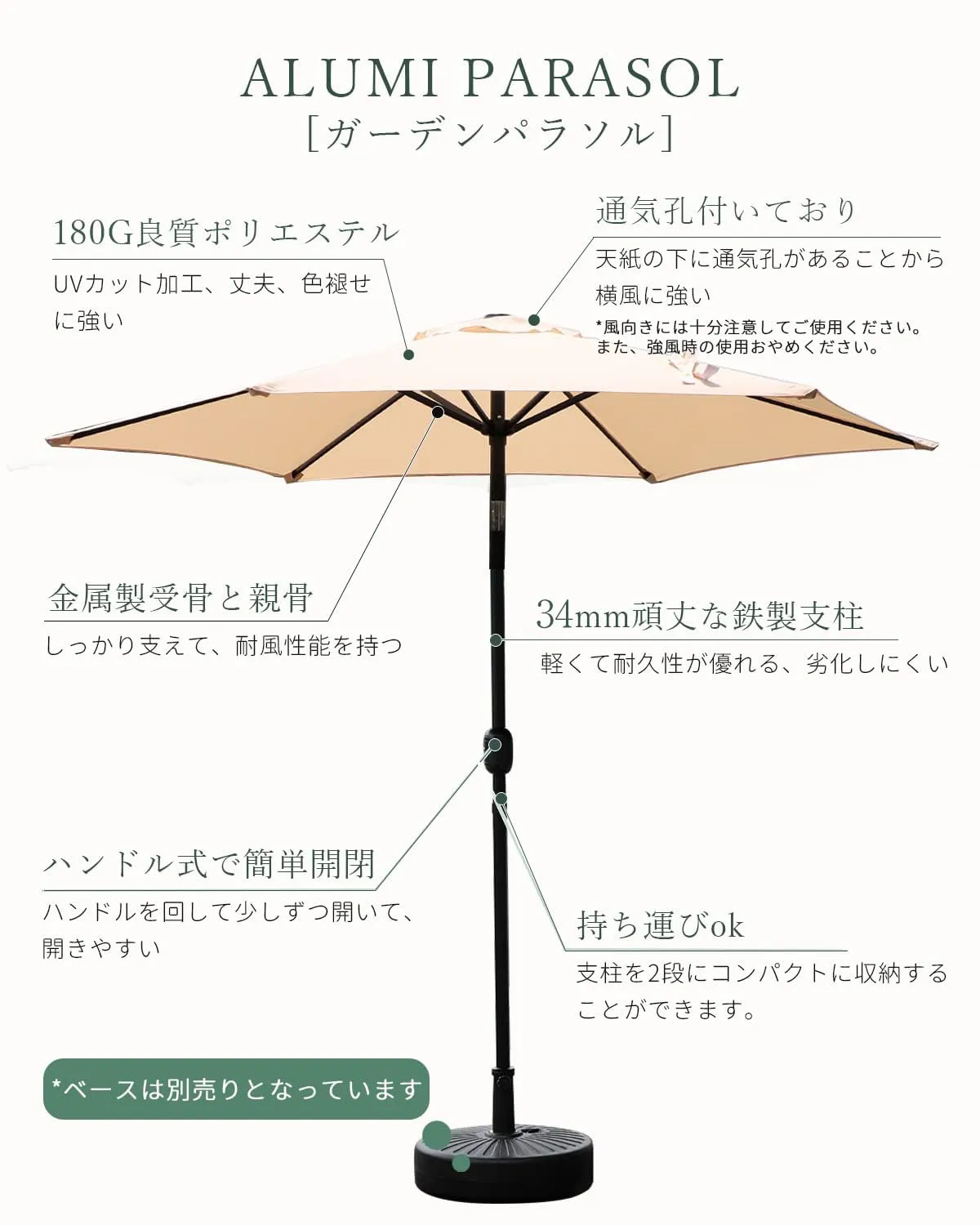 【通気孔付いて通気性高い】パラソルの上部には風を逃がす通気口を搭載、熱のこもりを防いで夏の暑さも軽減して、風圧による転倒しにくいです。(強風時の使用は大変危険でおやめください)