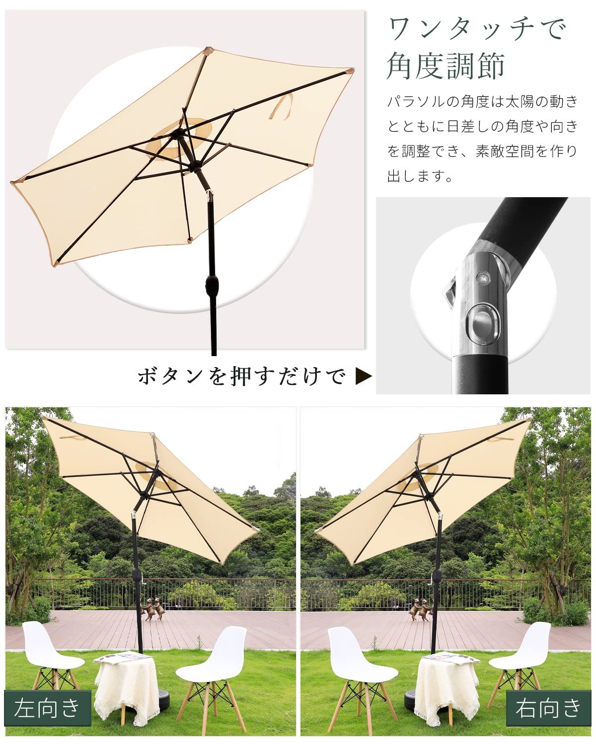 【角度調整で一日中快適に日除け】太陽の位置に合わせてパラソルの角度を左右に自由に調整可能。朝から夕方まで日差しをしっかりカットし、常に快適な日陰スペースを確保します。