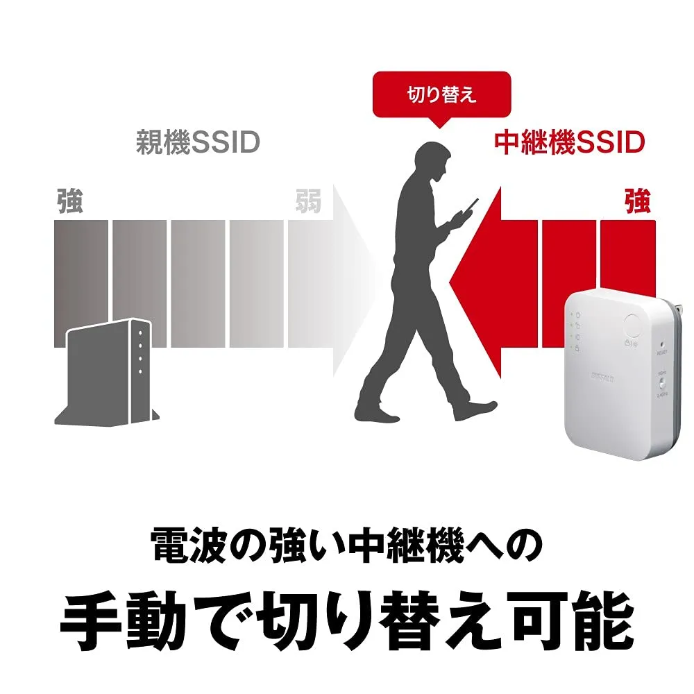 【中継機用SSID】電波が強い中継器へ「中継機用SSID」で手動で接続を切り替えることで、確実に中継器とつながる。