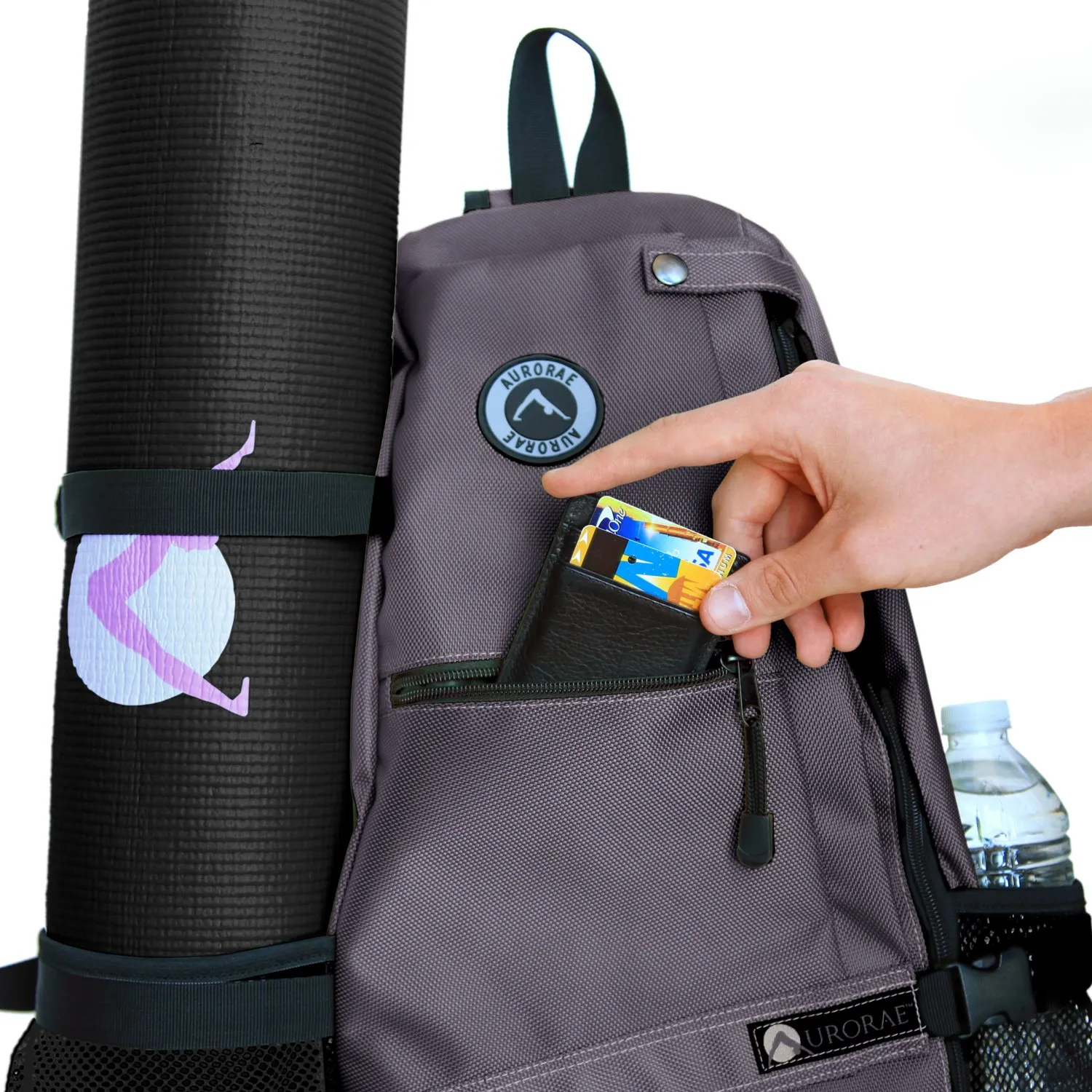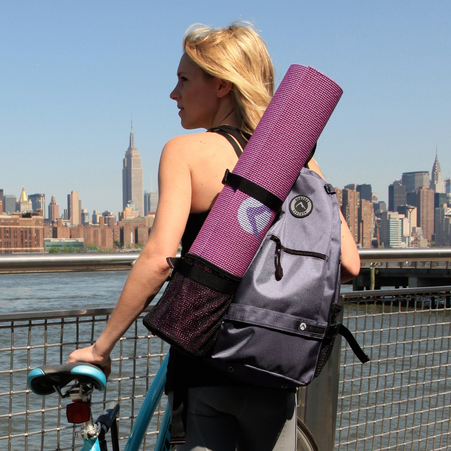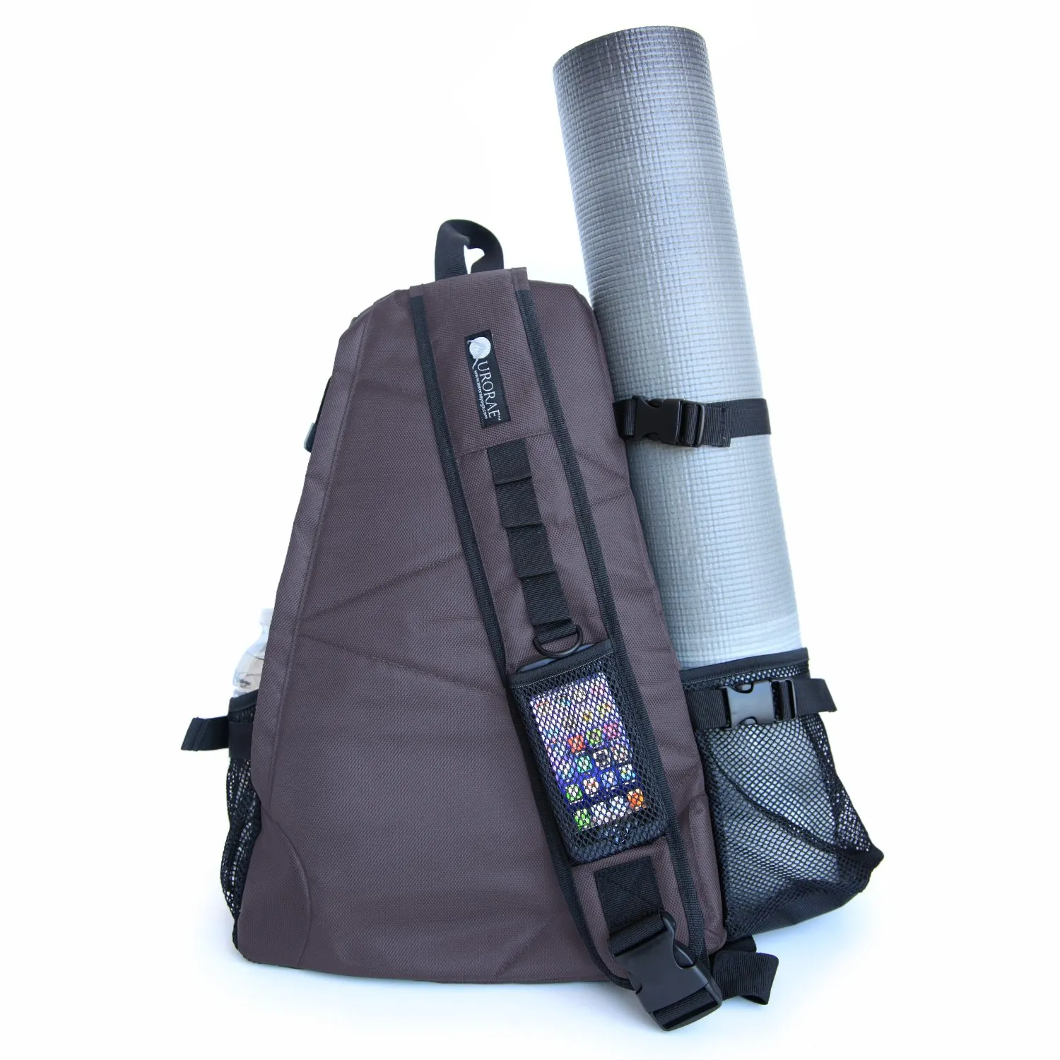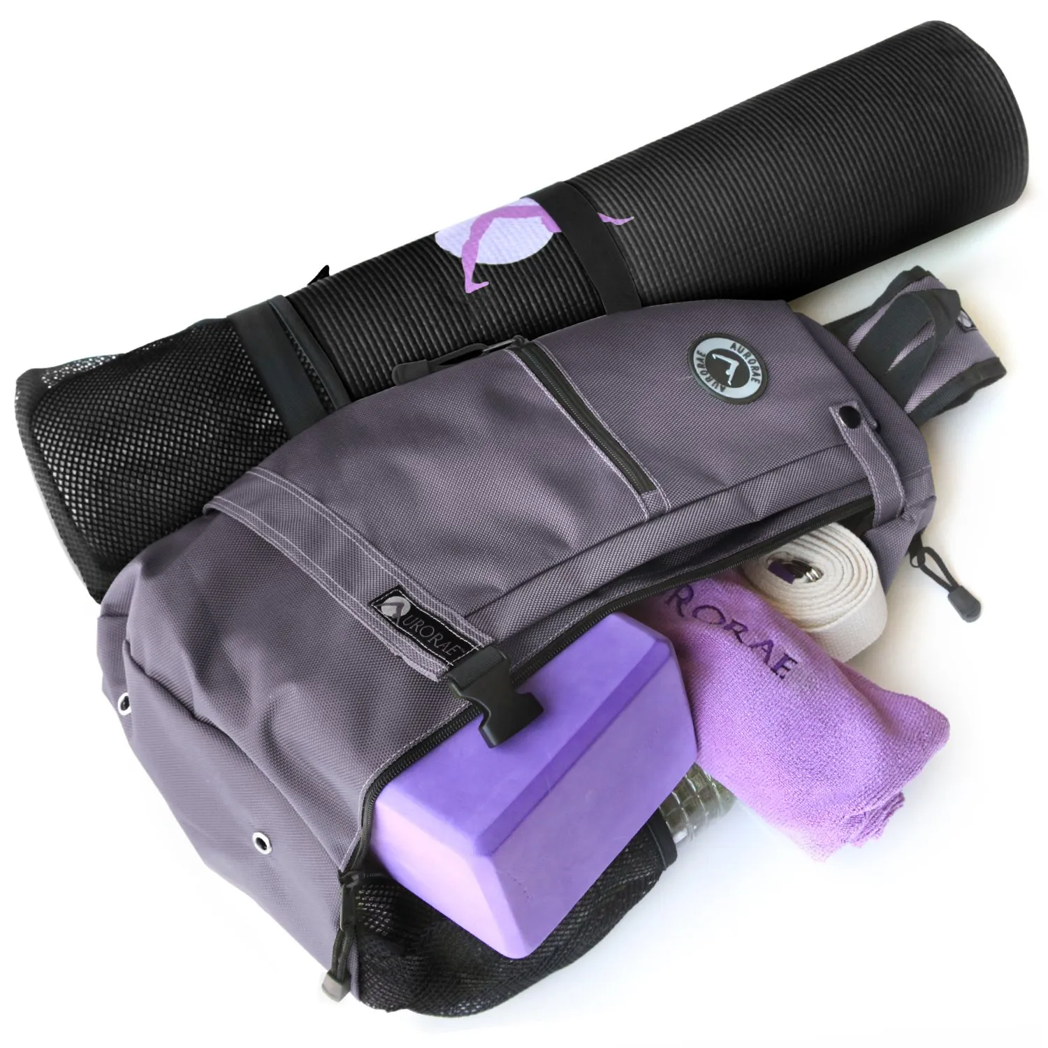 Auroraeヨガマットバッグは、丈夫で耐久性の高いポリエステル製で、5ポンド以下のほとんどのヨガマットを効果的に固定できる特殊なマットロッカーシステムを備えています。マットは長さ1/4インチと72インチ以下の厚さでなければなりません。