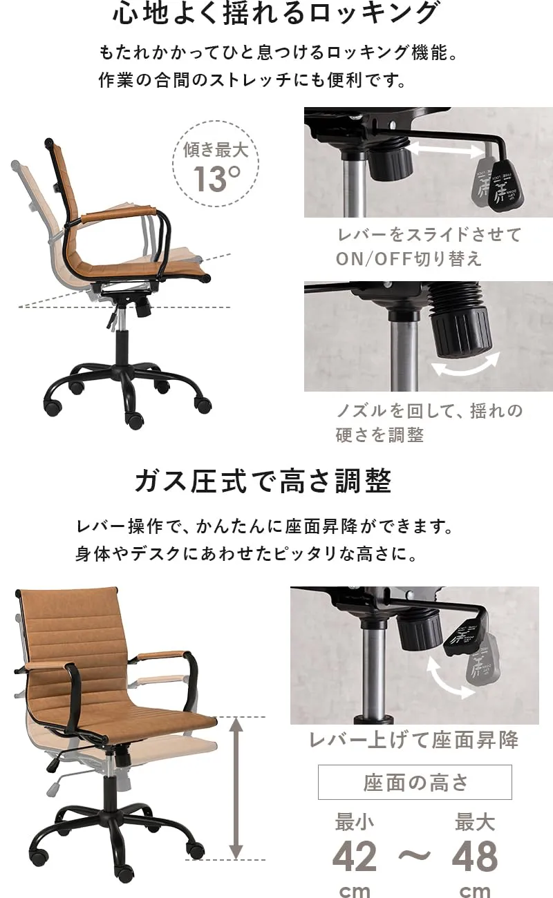 アームレストやロッキング機能、昇降機能もあるので、