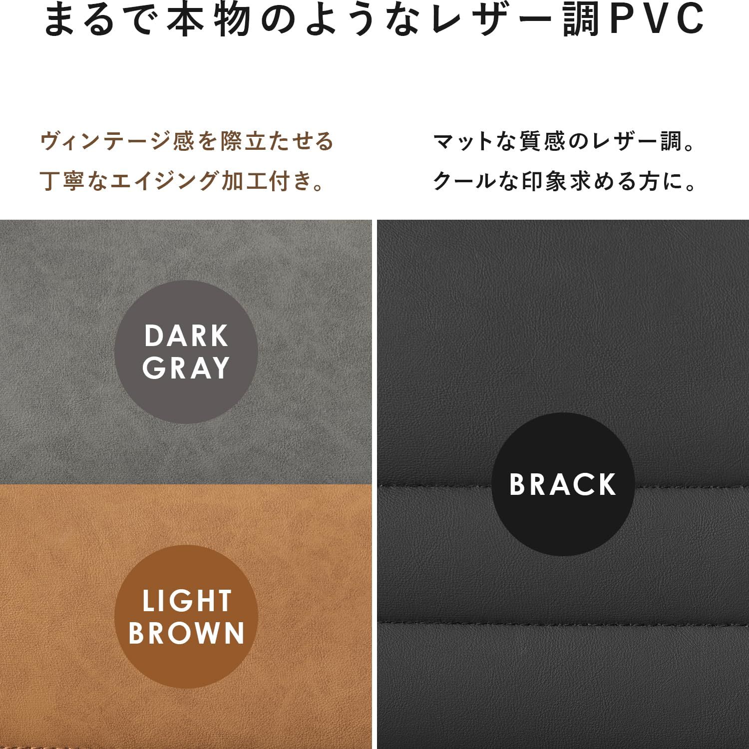 まるで本物のようなレザー調の生地。ヴィンテージ感のあるダークグレーとライトブラウン、マットな質感のブラックの3色展開。お手入れも簡単。