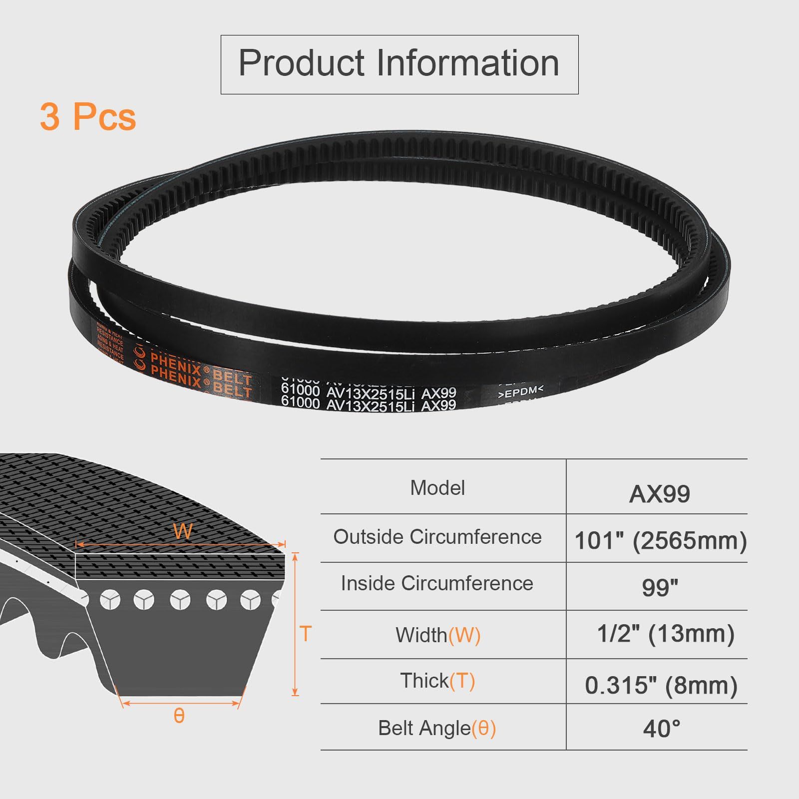 サイズ - AX99 クラシックコグ V ベルト、内周: 99 インチ、外周: 97 インチ (2465 mm)、幅: 1/2 インチ (13 mm)、厚さ: 0.315 インチ (8 mm)