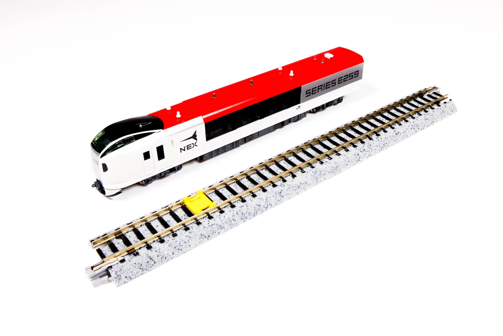 先頭車1両と展示用ユニトラック直線線路186mm1本、転動防止のための手歯止め1個が基本の製品形態です。