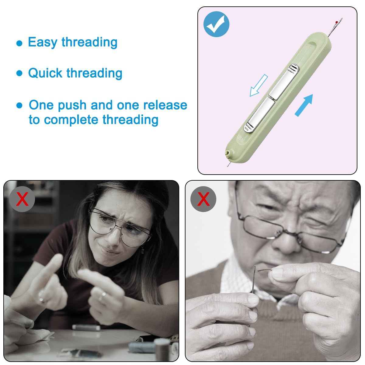 使いやすい:裁縫キットはシンプルな使用を念頭に置いて設計されており、針を穴に差し込み、糸を小さなフックに置き、引き戻すだけです。 簡単かつ迅速に糸を通すことができます。