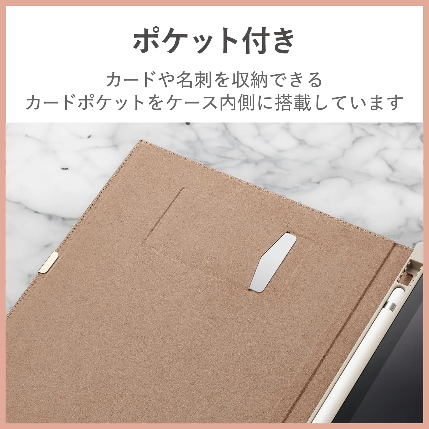 カードや名刺を収納できるカードポケットをケース内側に備えています。