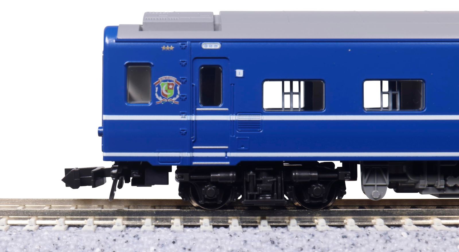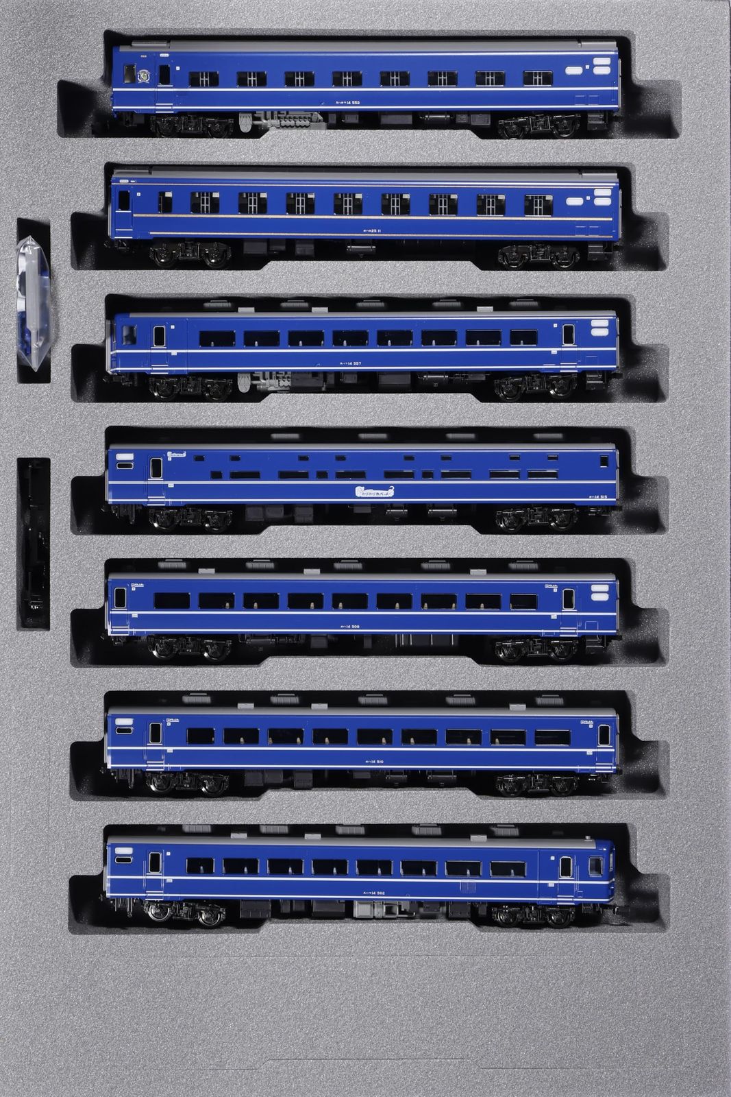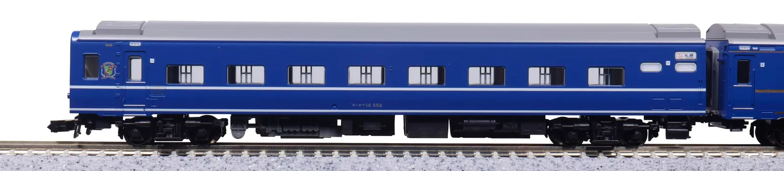 スハネフ14は、オハネフ25から改造された550番台の北海道形と呼ばれる切妻 (折妻)・白帯タイプを再現。