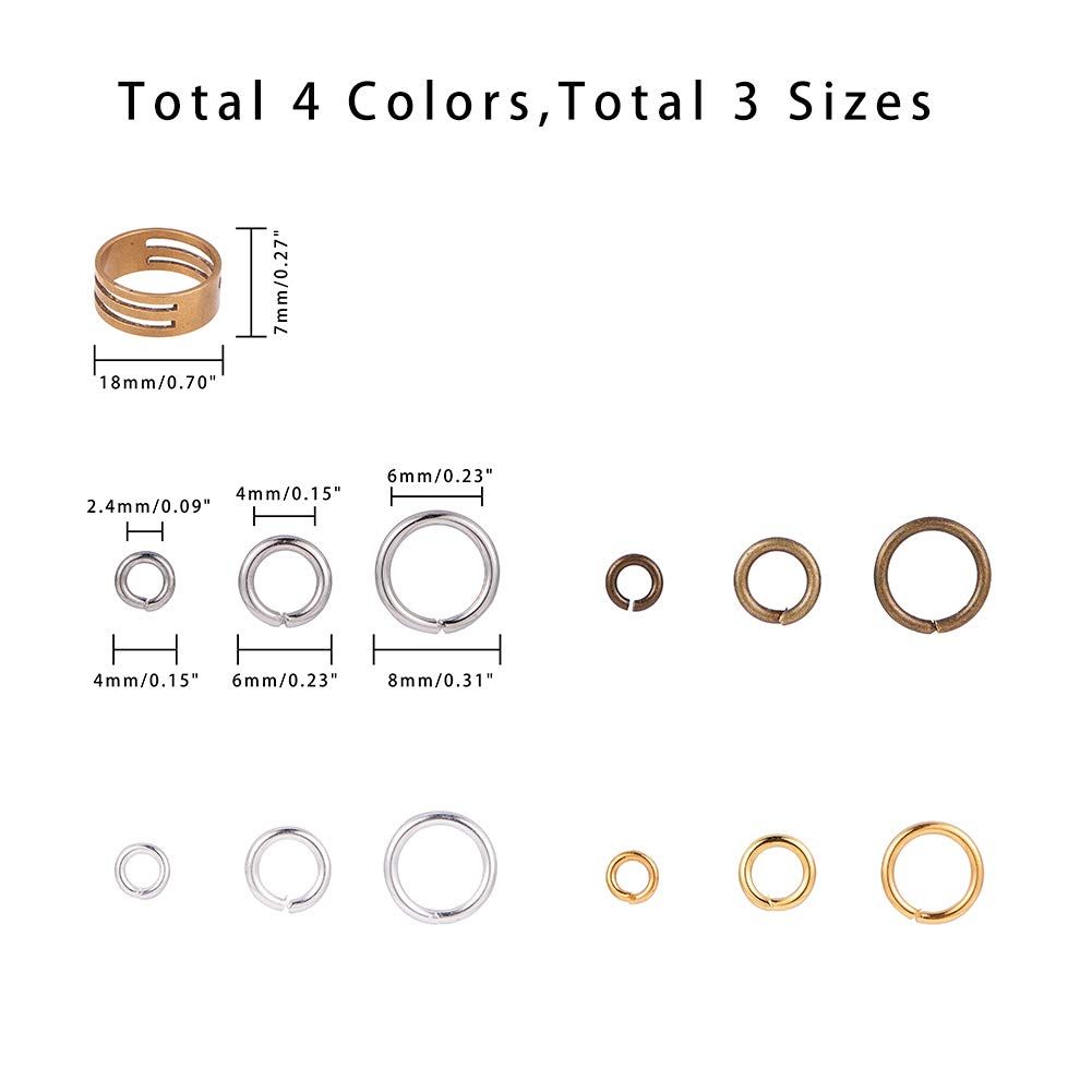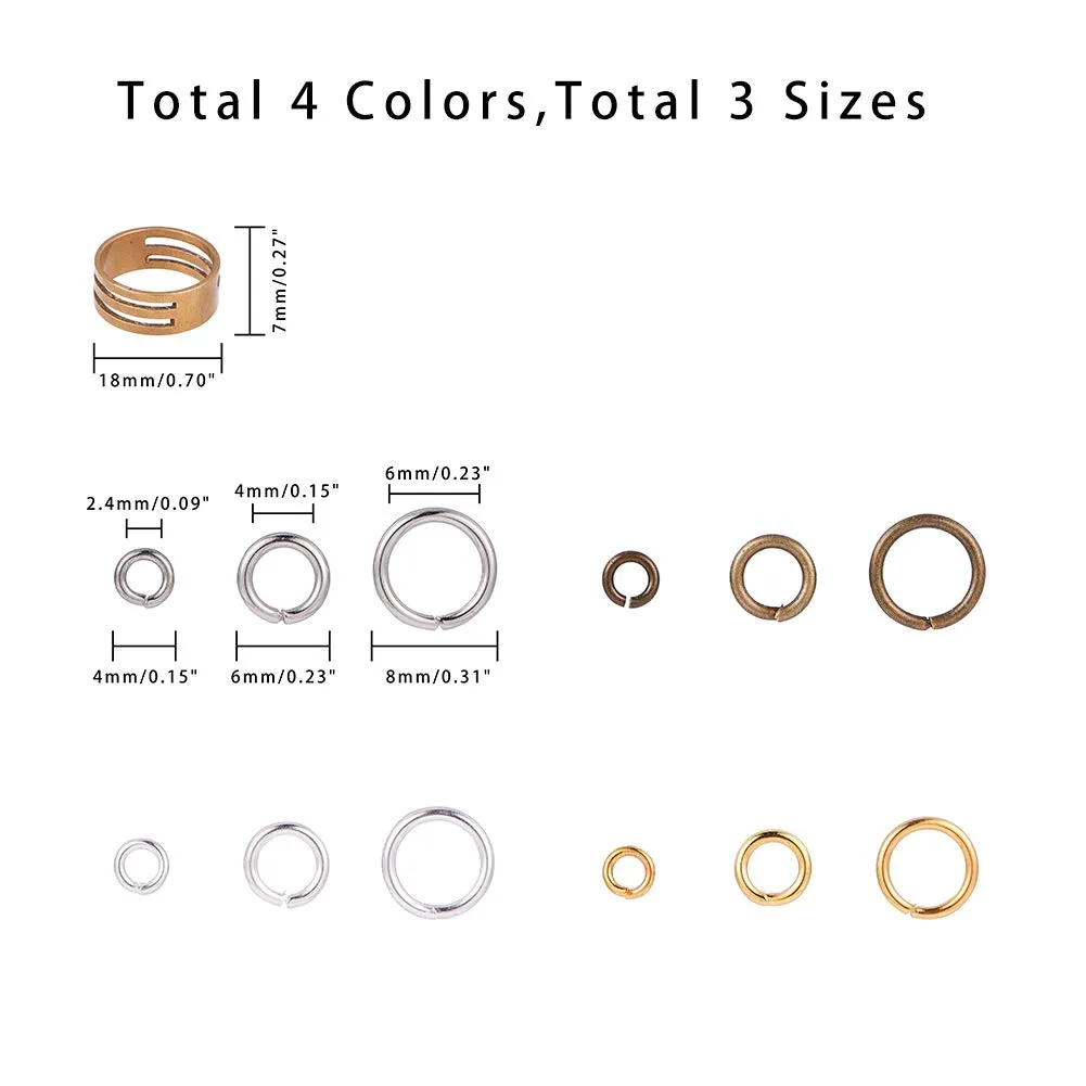 サイズ:真鍮ジャンプリング:4x0.8mm;内径約2.4mm;約235個/色、940個;ジャンプリング:直径約6mm、厚さ1mm、内径約4mm、約99個;ジャンプリング:直径6mm、厚さ0.9mm、内径約4.2mm、約88個;ジャンプリング:直径約6mm、厚さ1mm、内径約4mm、約88個/金属色、176個;ジャンプリング:直径約8mm、厚さ1mm、内径約6mm、金属色約46個、187個。