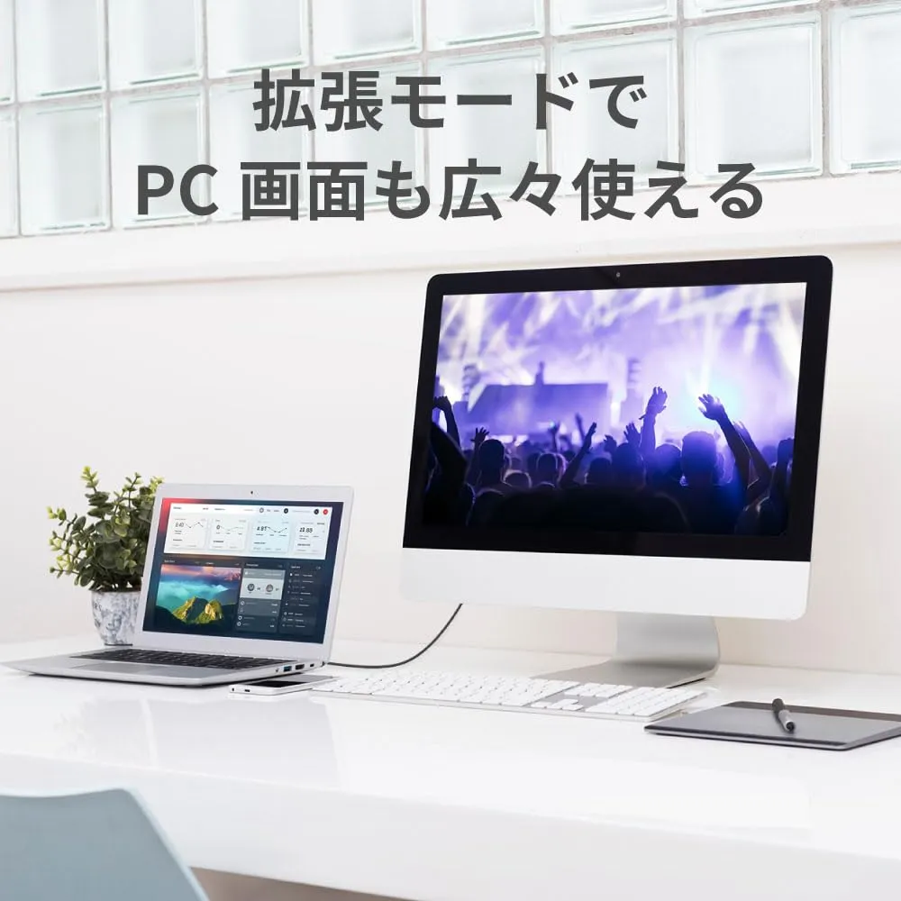 【 選べるミラーリング/拡張モード 】 本製品は、ミラーリングと拡張、どちらかを選んで使用することができます。ミラーリングでは全て同じ画面が表示されるため、大画面で映像やゲームを楽しめます。また、拡張モードでは異なる画面が表示されるため、並行作業や複数タブの使用に役立ちます。