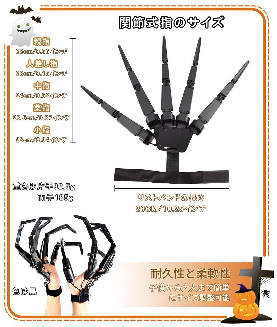 【??梱包内容】両手のセットになります。紙箱に詰めて、指の長さは22-24cmです。重さは片手92.5g、両手185g、色は黒です。ご注意:この関節指はワンサイズで、適切なフィット感を得るために、まず指の周囲を測り、計算してください。