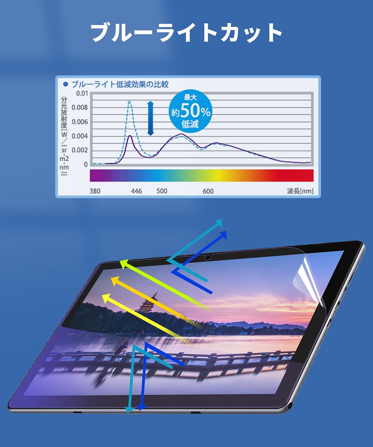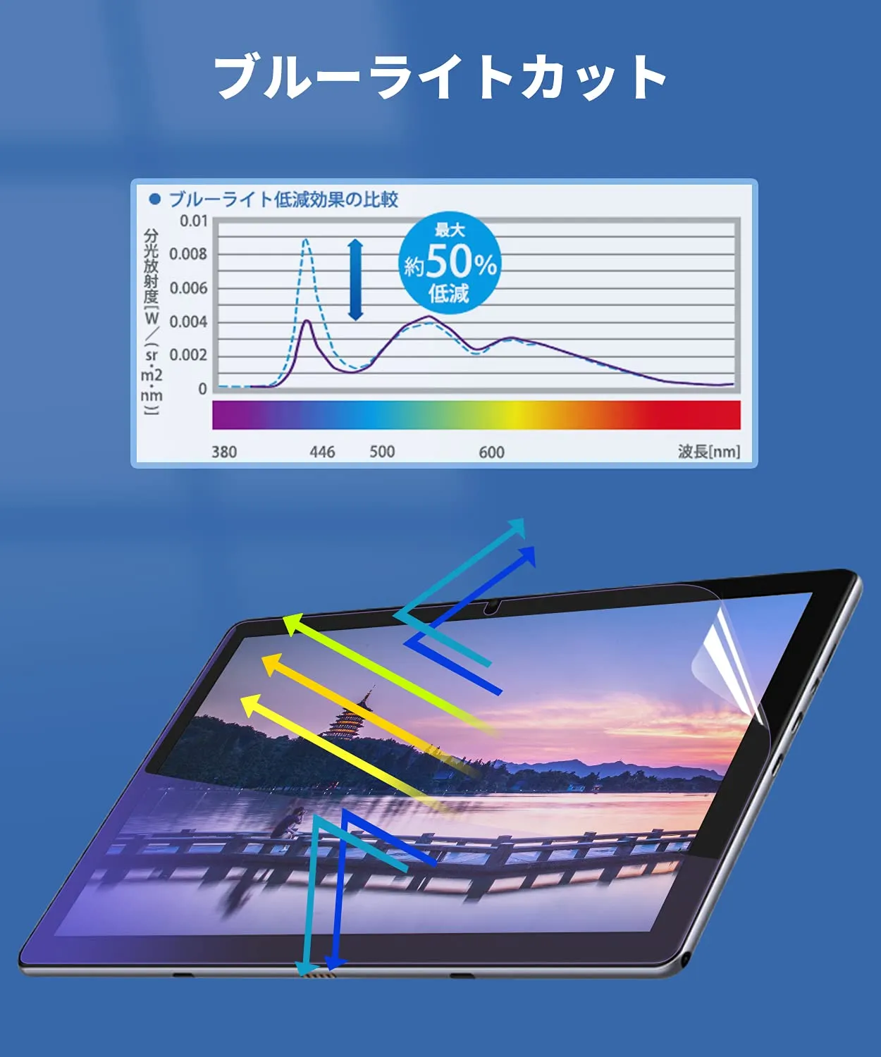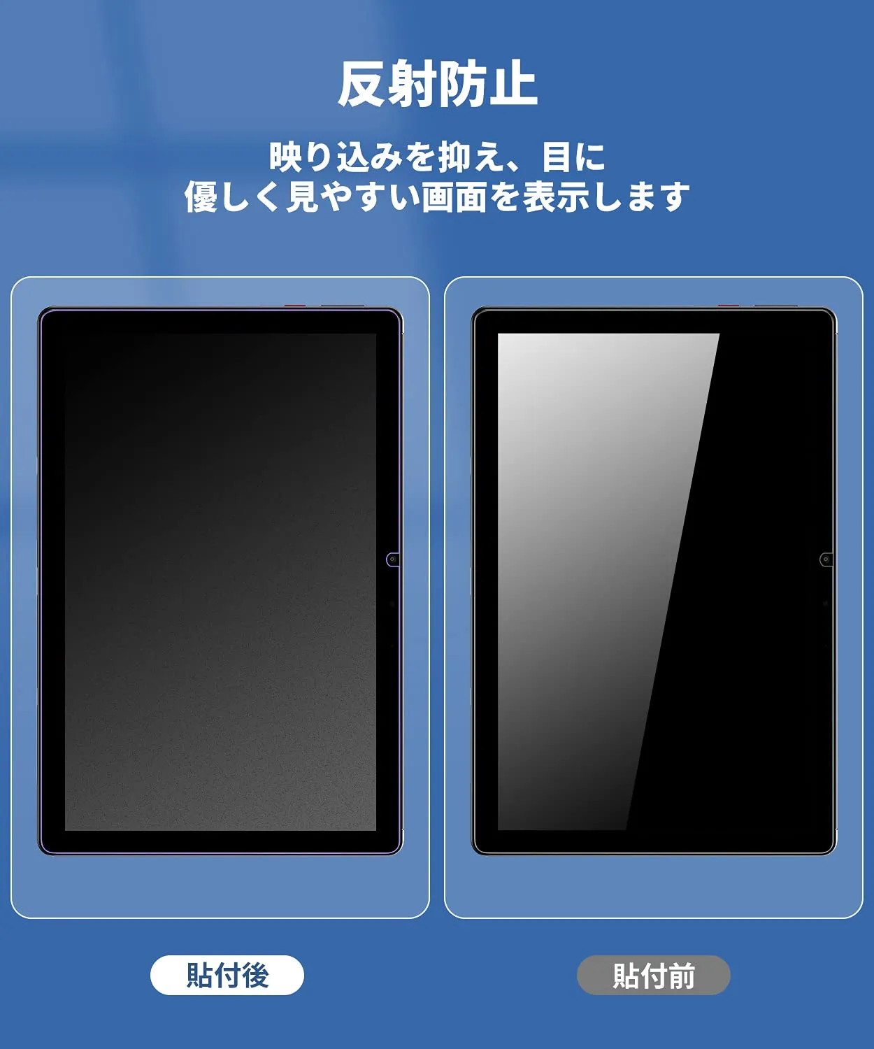 【反射防止】強い光による反射を抑え、画面が見えやすくなる超反射防止加工を施した ブルーライトカットタイプの液晶保護フィルムです。 ライトの反射や映り込みを低減し、ギラつきが無くなり画面が見やすくなります。