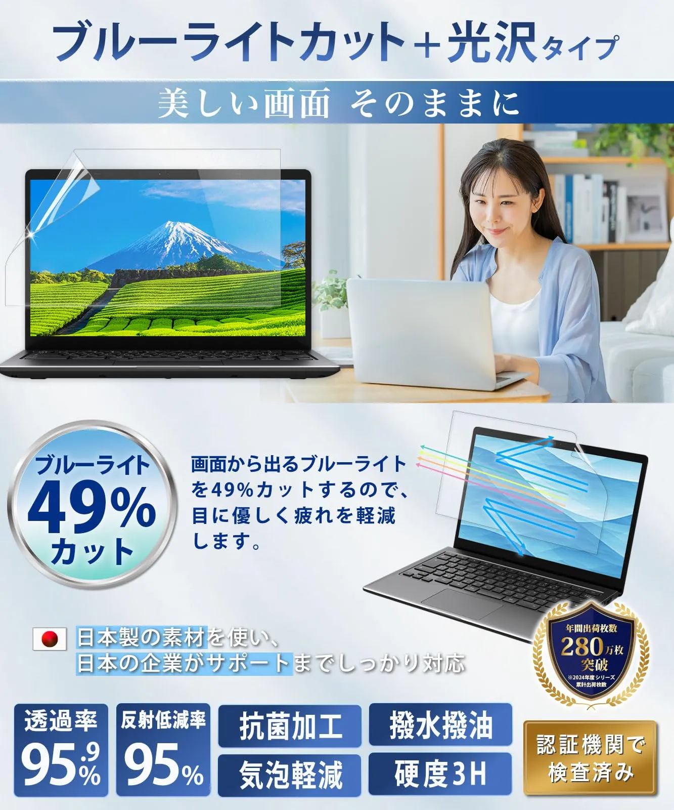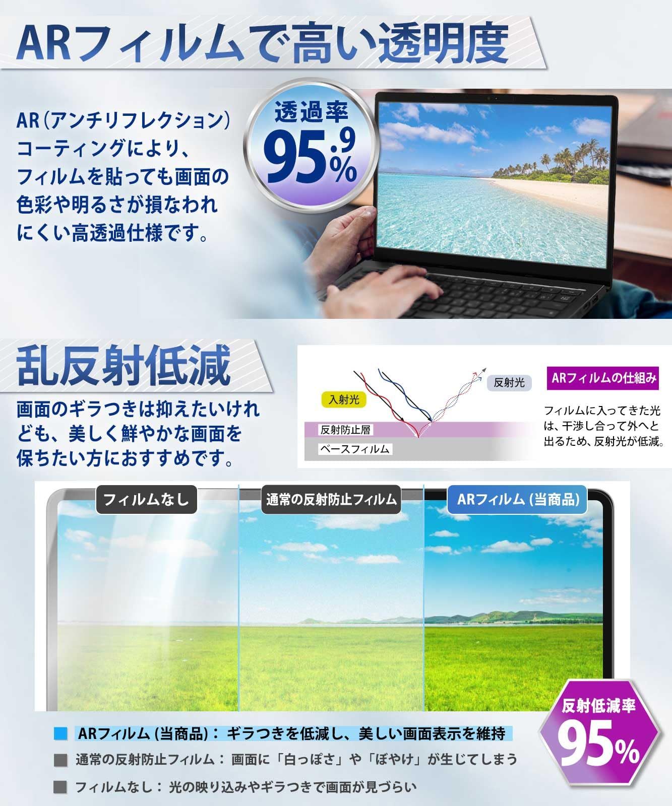 【光沢なのにギラつきを抑える】 AR(アンチリフレクション)フィルムは2つの反射光をお互いに打ち消し合うことで乱反射を防ぎ、ギラつきを抑える仕組みになっています(反射低減率:95.7%)。ギラつきは抑えたいけれども、美しく鮮やかな画面は保ちたい方や光が反射しやすい場所でパソコンの作業をする方におすすめです。 ※反射防止フィルムではないことをあらかじめご了承ください。