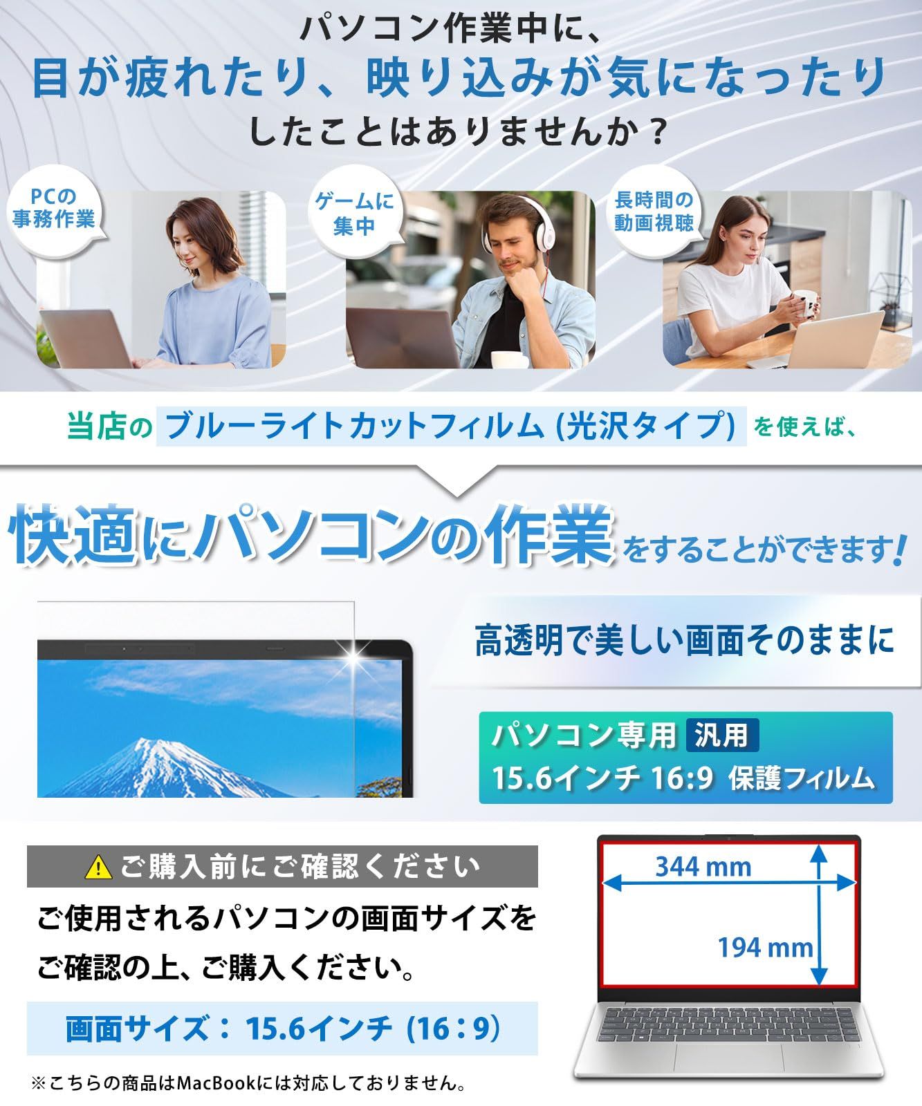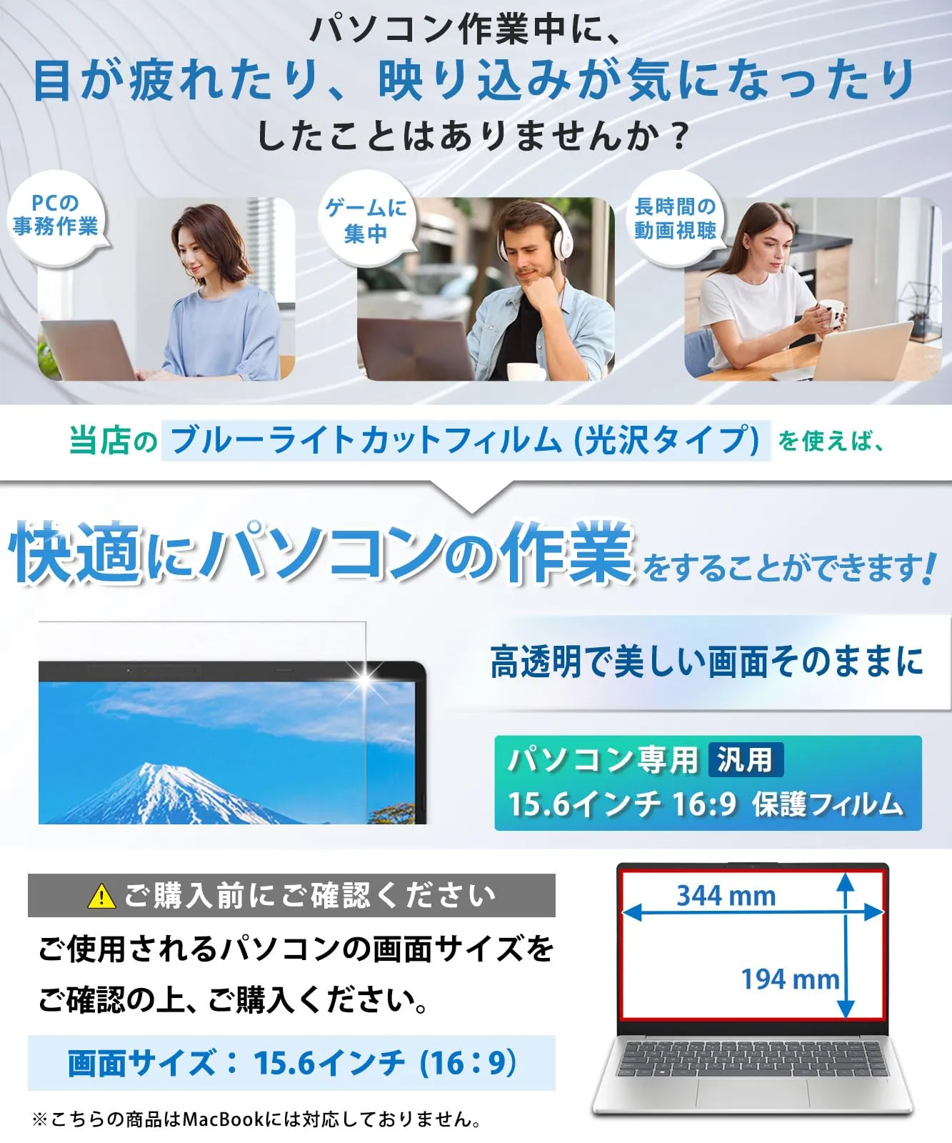 【対応サイズ】15.6インチ 16:9 フィルダーサイズ:344mm x 194mm