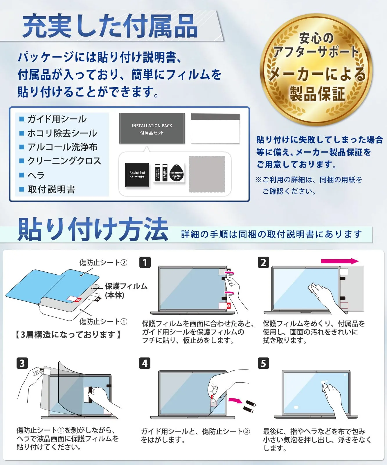 【内容】保護フィルム 1枚 取付説明書(日本語)、付属品(ホコリ除去シール、アルコール洗浄布、クリーニングクロス、ヘラ)
