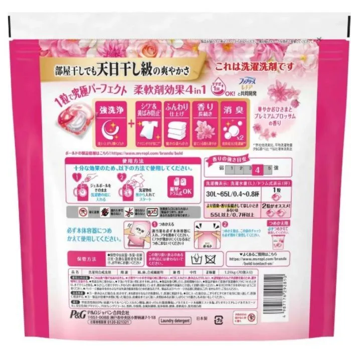 使用方法:十分な効果のため、以下の方法で使用してください。ジェルボールをそのまま洗濯槽の底に入れる。洗濯物を後から入れてスタート。洗剤投入口には入れない(製品がつまり、水があふれる恐れがあります。) 洗濯機表示:洗濯水量(L) / ドラム式表示(杯) 30L~65L/0.4~0.8杯 1粒。より消臭・香り長続きしてほしいときあるいは55L以上/0.7杯以上 2粒がオススメ!保管方法:保管中は高温・多湿・直射日光・急激な温度変化を避け、お早めにお使いください。必ず本体容器につめかえて使用してください。適当量を必ず本体容器に入れ、フタを閉めてください。(フタが閉まりにくくなるほどつめこまないでください)つめかえ後は、この袋のチャックを必ず閉めて保管してください。