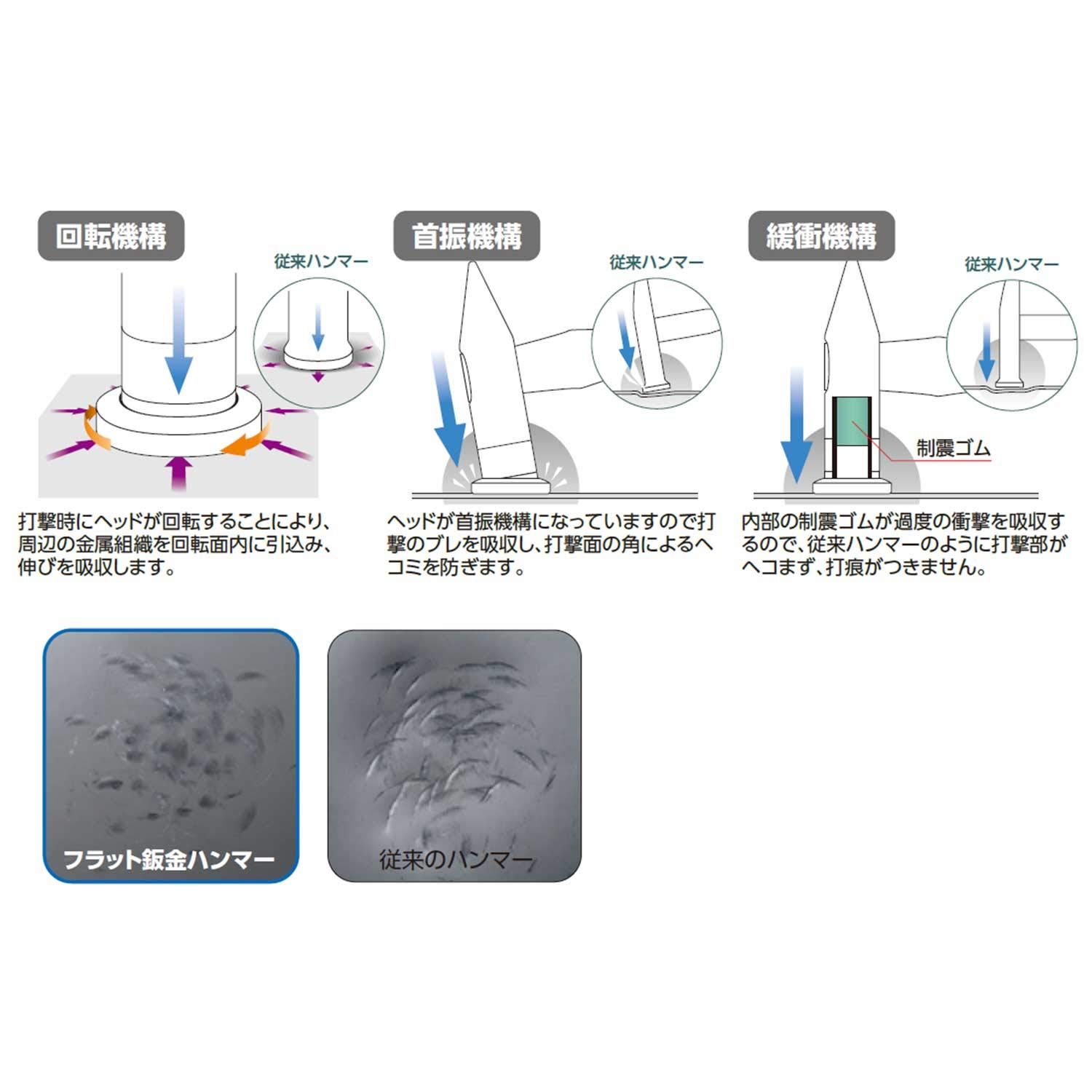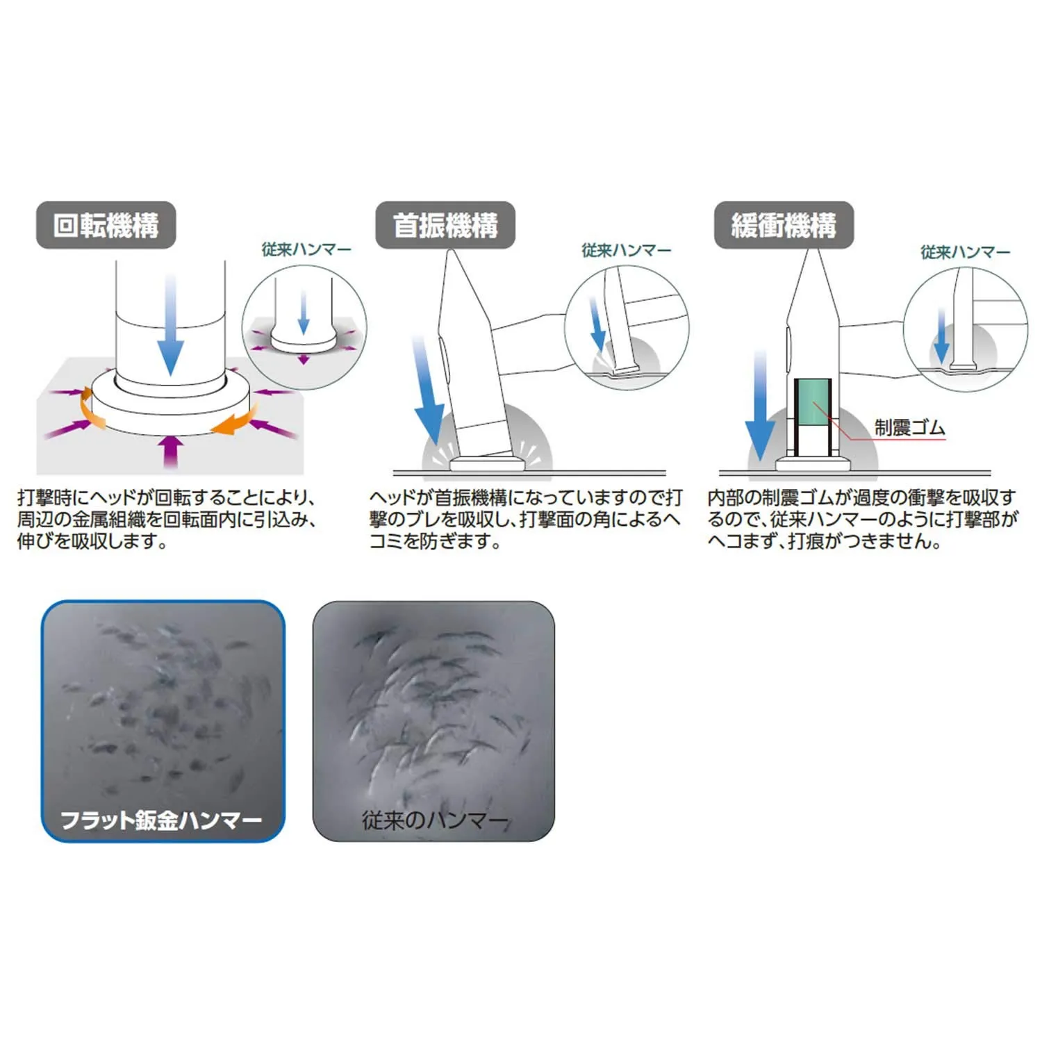 回転機構:打撃時にヘッドが回転し、周辺の金属組織を引き込み、伸びを吸収します。