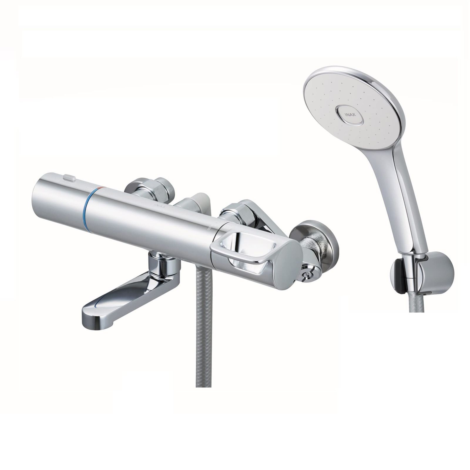 設定温度に自動で調整されるサーモスタット式シャワーバス水栓の洗い場専用短尺吐水口タイプ。