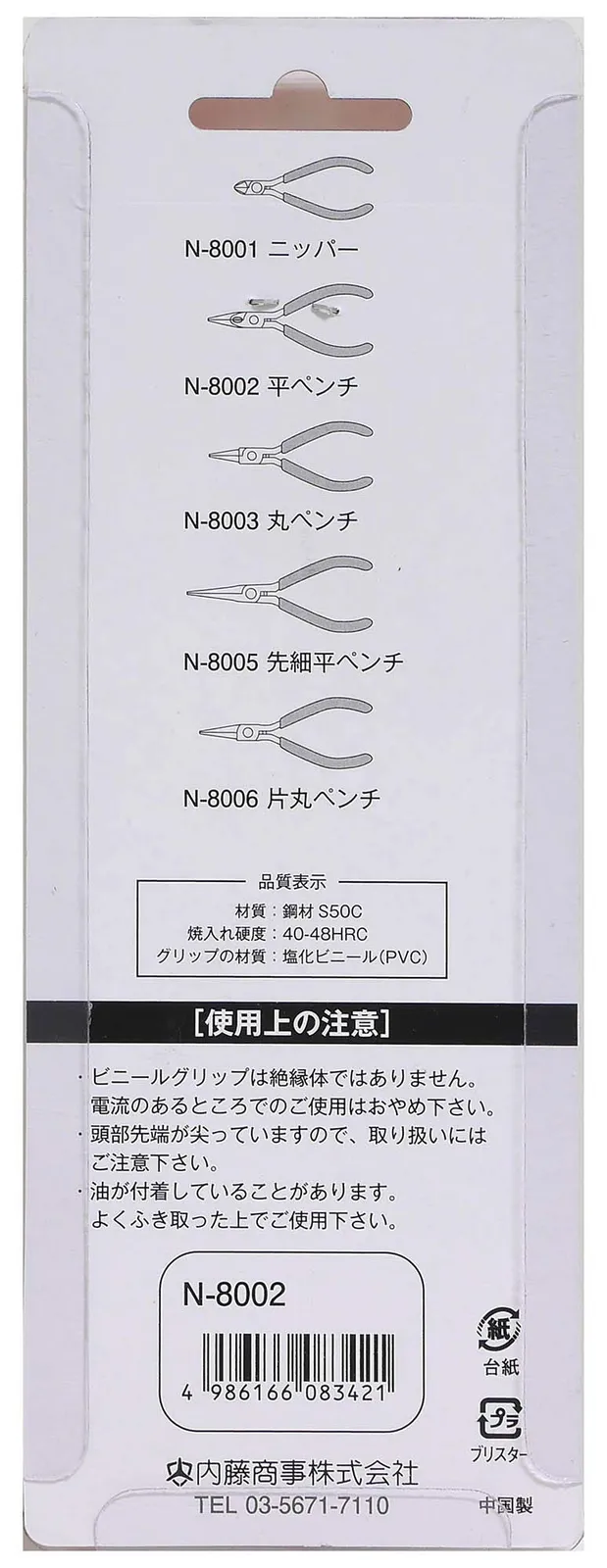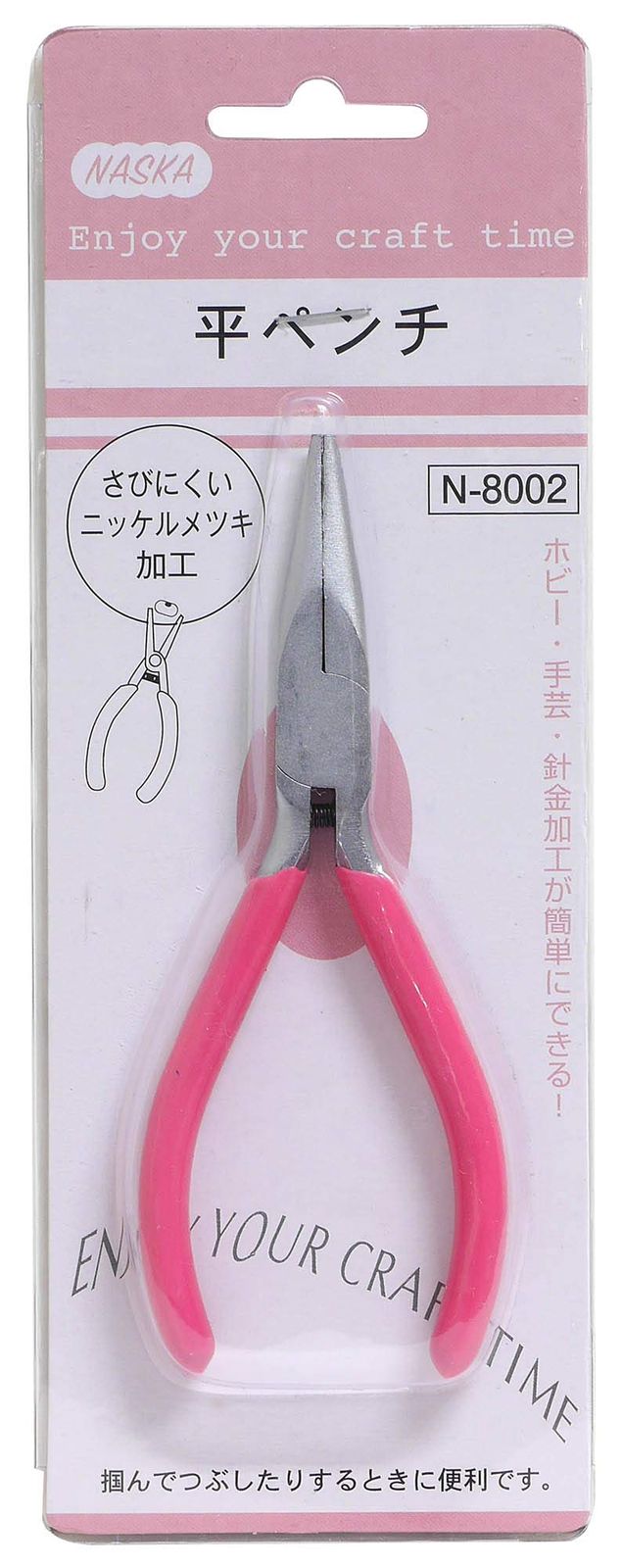 手工芸用・平ペンチ。金具をつぶす、曲げる、つかむ等、多用途なペンチです。
