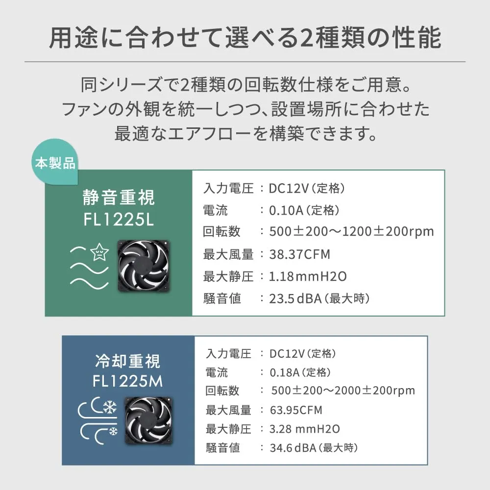 用途に合わせて選べる2種類の性能:同シリーズで2種類の回転数仕様をご用意。静音重視のPCには「OWL-FL1225L-BK(本製品)」、冷却重視のPCには「OWL-FL1225M-BK 」と、求める要素に合わせてお選びいただけます。ファンの外観を統一しつつ、設置場所に合わせた最適なエアフローを構築できます。