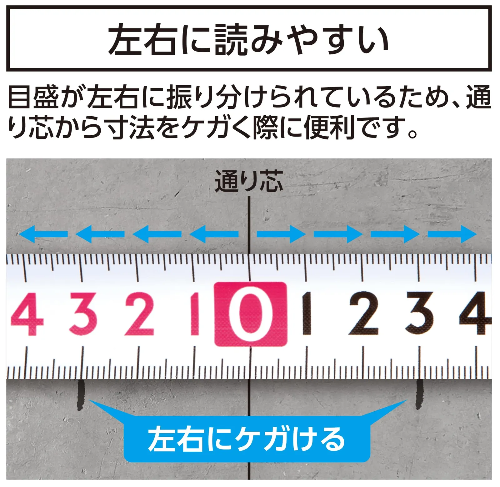 目盛が左右に振り分けられているため、通り芯から寸法をケガく際に便利。