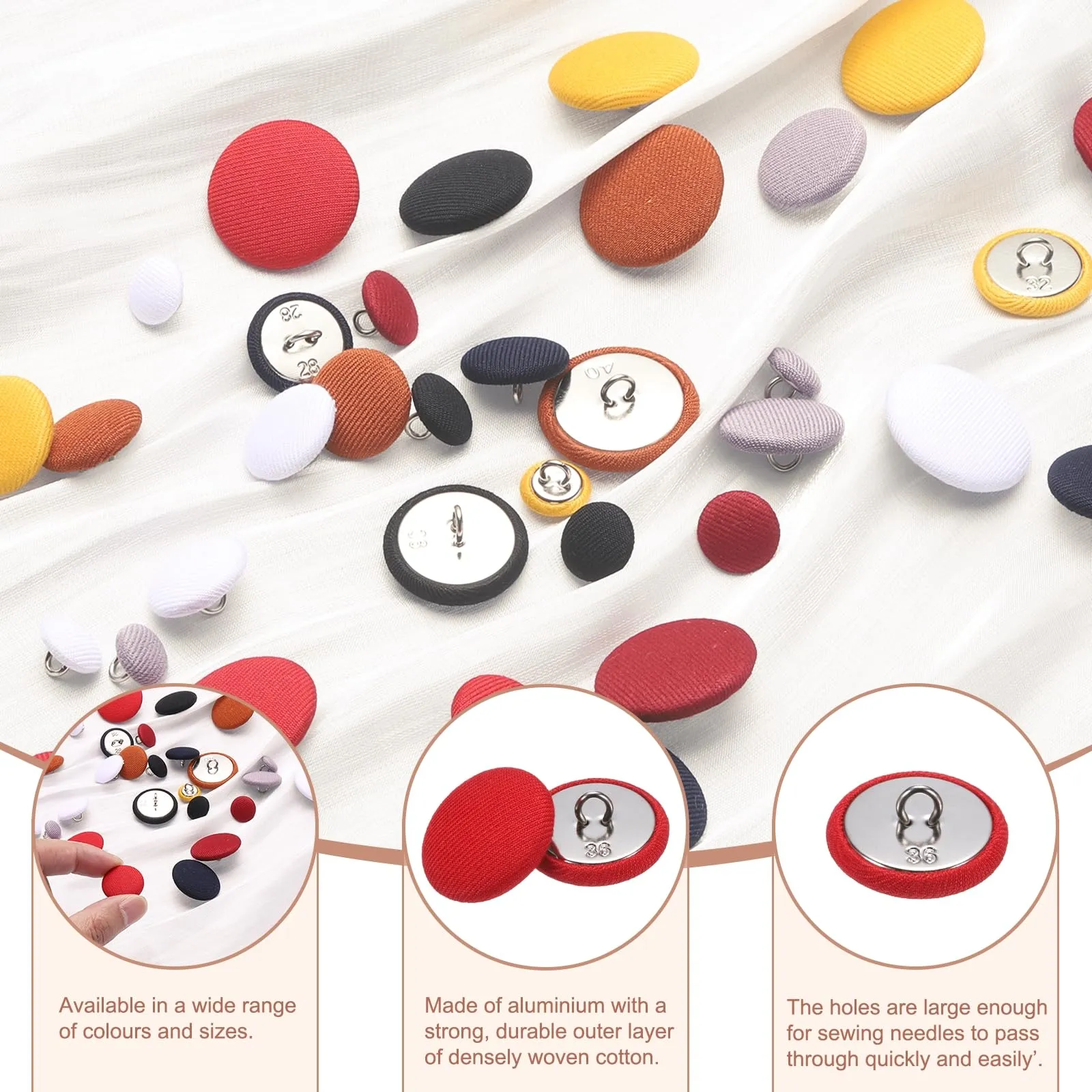 縫いボタンはアルミ製で強く耐久性があり、しっかりと織られた綿の生地で覆われており、洋服を傷つけることなく繰り返し洗濯できます。